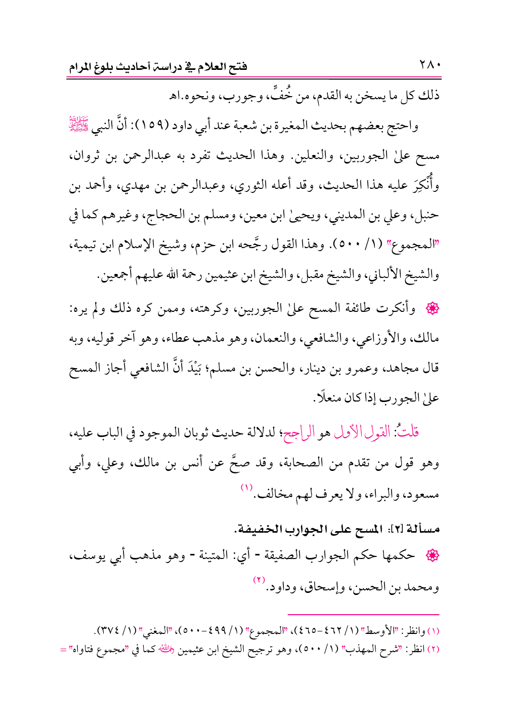 واحتج بعضهم بحديث المغيرة بن شعبة عند أبي داود (١٥٩): أنَّ النبي -صلى الله عليه وعلى آله وسلم- مسح على الجوربين، والنعلين. وهذا الحديث تفرد به عبدالرحمن بن ثروان، وأُنْكِرَ عليه هذا الحديث، وقد أعله الثوري، وعبدالرحمن بن مهدي، وأحمد بن حنبل، وعلي بن المديني، ويحيى ابن معين، ومسلم بن الحجاج، وغيرهم كما في «المجموع» (١/ ٥٠٠). وهذا القول رجَّحه ابن حزم، وشيخ الإسلام ابن تيمية، والشيخ الألباني، والشيخ مقبل، والشيخ ابن عثيمين رحمة الله عليهم أجمعين.