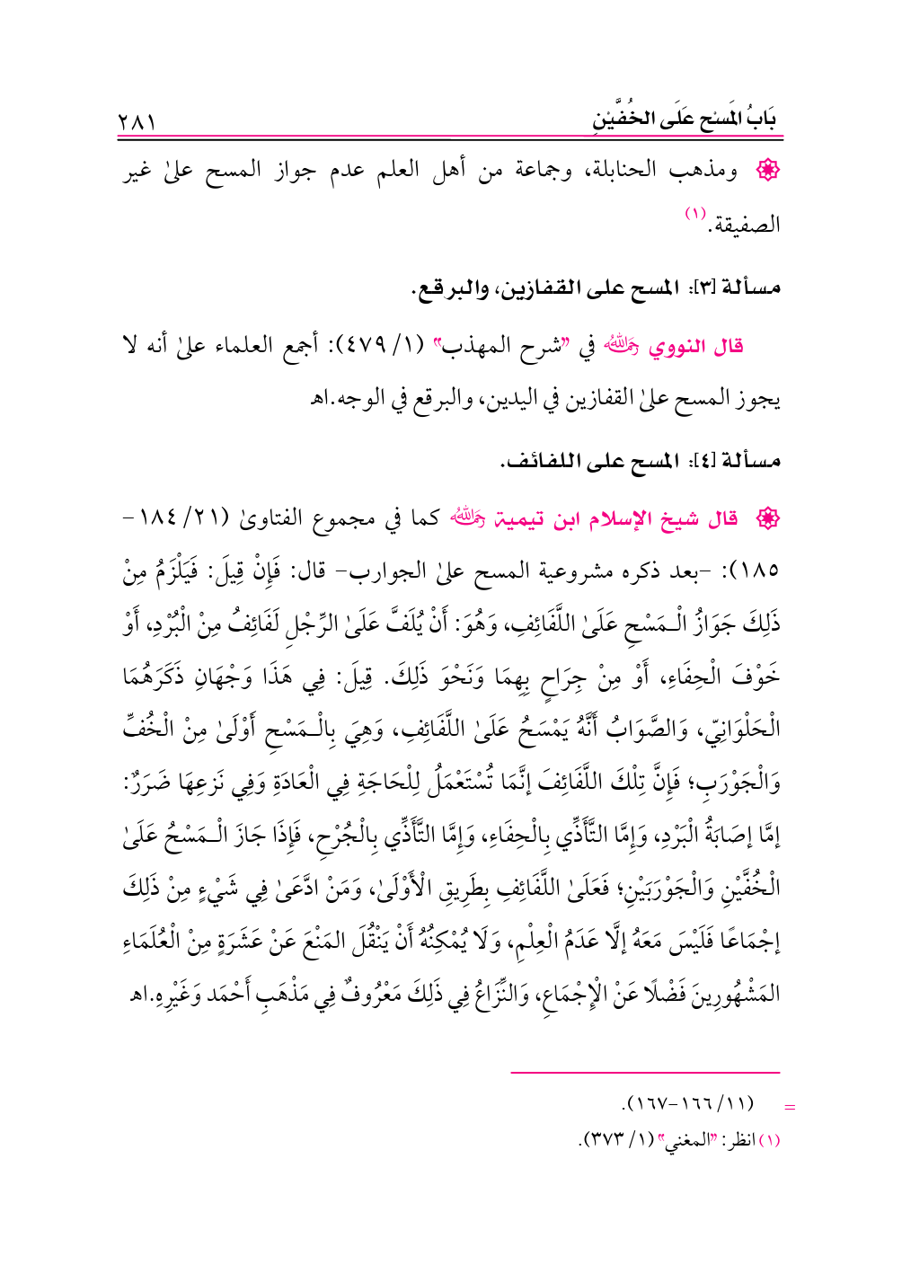 • قال شيخ الإسلام ابن تيمية -رحمه الله- كما في مجموع الفتاوى (٢١/ ١٨٤ - ١٨٥): -بعد ذكره مشروعية المسح على الجوارب- قال: فَإِنْ قِيلَ: فَيَلْزَمُ مِنْ ذَلِكَ جَوَازُ الْمَسْحِ عَلَى اللَّفَائِفِ، وَهُوَ: أَنْ يُلَفَّ عَلَى الرِّجْلِ لَفَائِفُ مِنْ الْبُرْدِ، أَوْ خَوْفَ الْحِفَاءِ، أَوْ مِنْ جِرَاحٍ بِهِمَا وَنَحْوَ ذَلِكَ. قِيلَ: فِي هَذَا وَجْهَانِ ذَكَرَهُمَا الْحَلْوَانِيّ، وَالصَّوَابُ أَنَّهُ يَمْسَحُ عَلَى اللَّفَائِفِ، وَهِيَ بِالْمَسْحِ أَوْلَى مِنْ الْخُفِّ وَالْجَوْرَبِ؛ فَإِنَّ تِلْكَ اللَّفَائِفَ إنَّمَا تُسْتَعْمَلُ لِلْحَاجَةِ فِي الْعَادَةِ وَفِي نَزعِهَا ضَرَرٌ: إمَّا إصَابَةُ الْبَرْدِ، وَإِمَّا التَّأَذِّي بِالْحِفَاءِ، وَإِمَّا التَّأَذِّي بِالْجُرْحِ، فَإِذَا جَازَ الْمَسْحُ عَلَى الْخُفَّيْنِ وَالْجَوْرَبَيْنِ؛ فَعَلَى اللَّفَائِفِ بِطَرِيقِ الْأَوْلَى، وَمَنْ ادَّعَى فِي شَيْءٍ مِنْ ذَلِكَ إجْمَاعًا فَلَيْسَ مَعَهُ إلَّا عَدَمُ الْعِلْمِ، وَلَا يُمْكِنُهُ أَنْ يَنْقُلَ المَنْعَ عَنْ عَشَرَةٍ مِنْ الْعُلَمَاءِ المَشْهُورِينَ فَضْلًا عَنْ الْإِجْمَاعِ، وَالنِّزَاعُ فِي ذَلِكَ مَعْرُوفٌ فِي مَذْهَبِ أَحْمَد وَغَيْرِهِ. اهـ