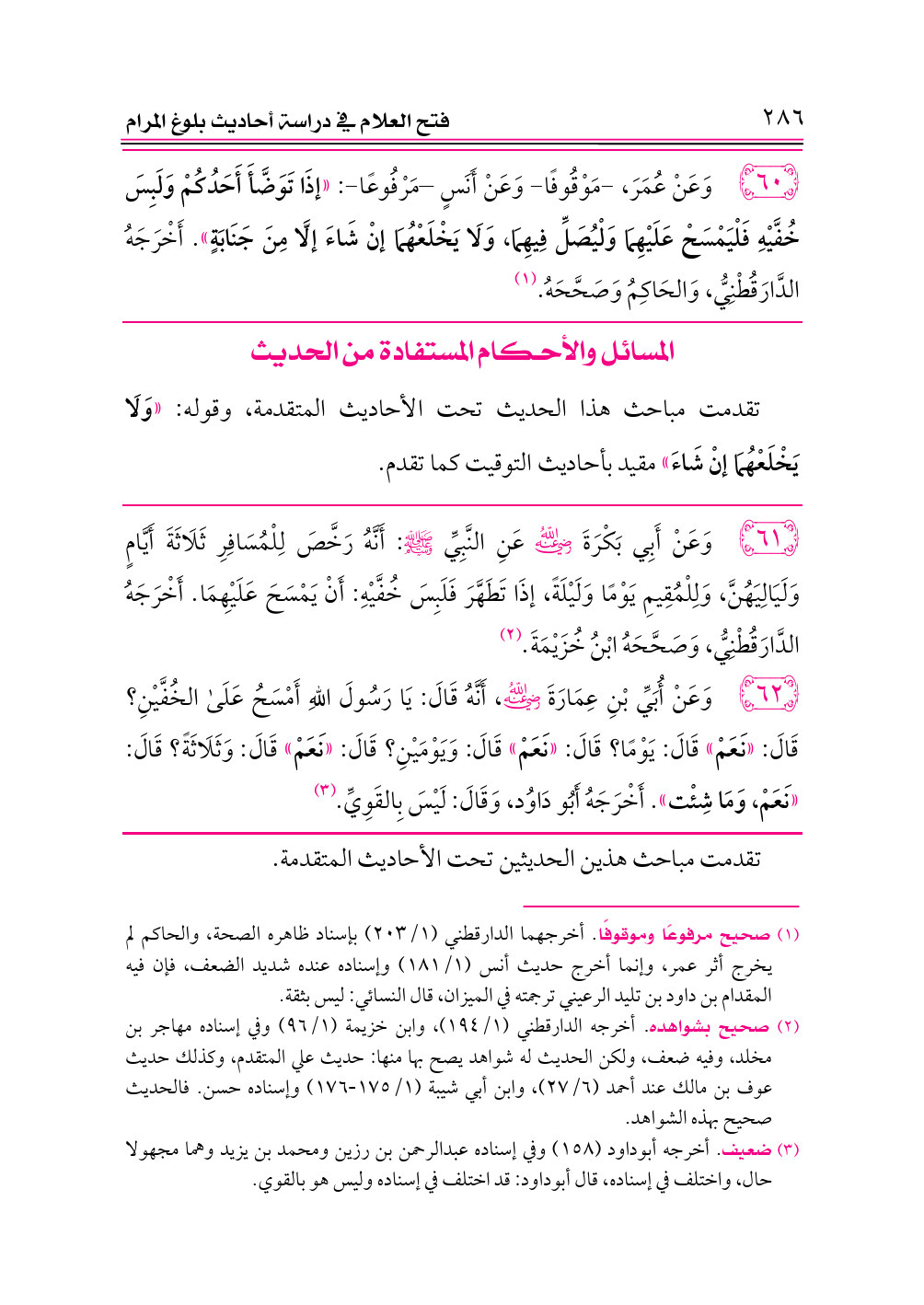 ٦١ - وَعَنْ أَبِي بَكْرَةَ -رضي الله عنه- عَنِ النَّبِيِّ - صلى الله عليه وسلم -: أَنَّهُ رَخَّصَ لِلْمُسَافِرِ ثَلَاثَةَ أَيَّامٍ وَلَيَالِيَهُنَّ، وَلِلْمُقِيمِ يَوْمًا وَلَيْلَةً، إذَا تَطَهَّرَ فَلَبِسَ خُفَّيْهِ: أَنْ يَمْسَحَ عَلَيْهِمَا. أَخْرَجَهُ الدَّارَقُطْنِيُّ، وَصَحَّحَهُ ابْنُ خُزَيْمَةَ. (¬٢)