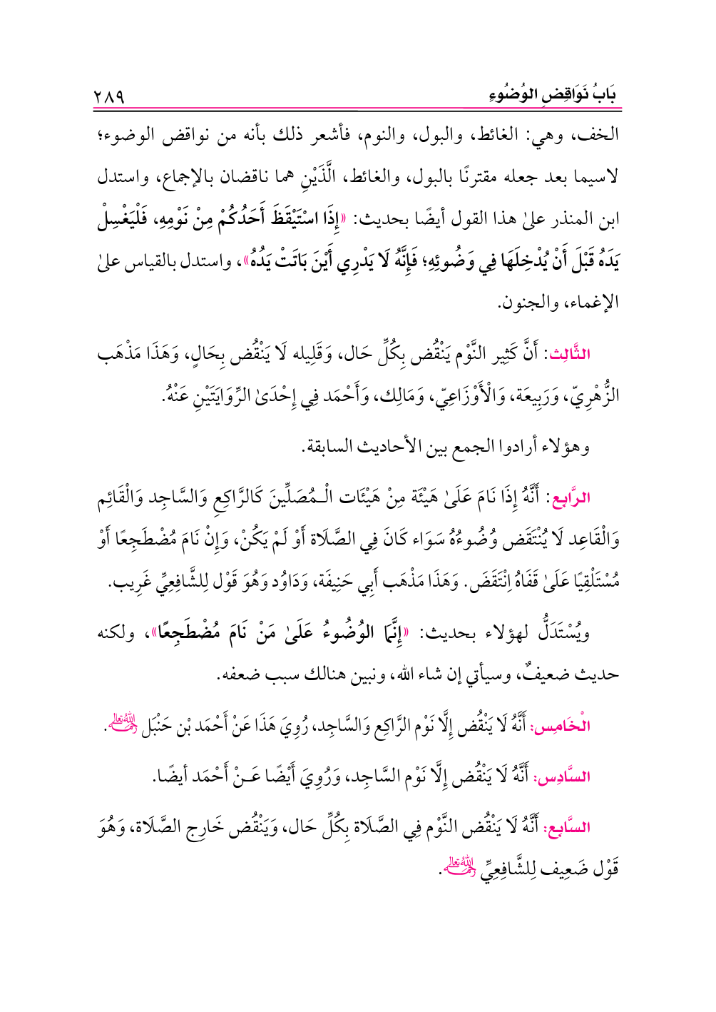 الْخَامِس: أَنَّهُ لَا يَنْقُض إِلَّا نَوْم الرَّاكِع وَالسَّاجِد، رُوِيَ هَذَا عَنْ أَحْمَد بْن حَنْبَل -رحمه الله تعالى-.