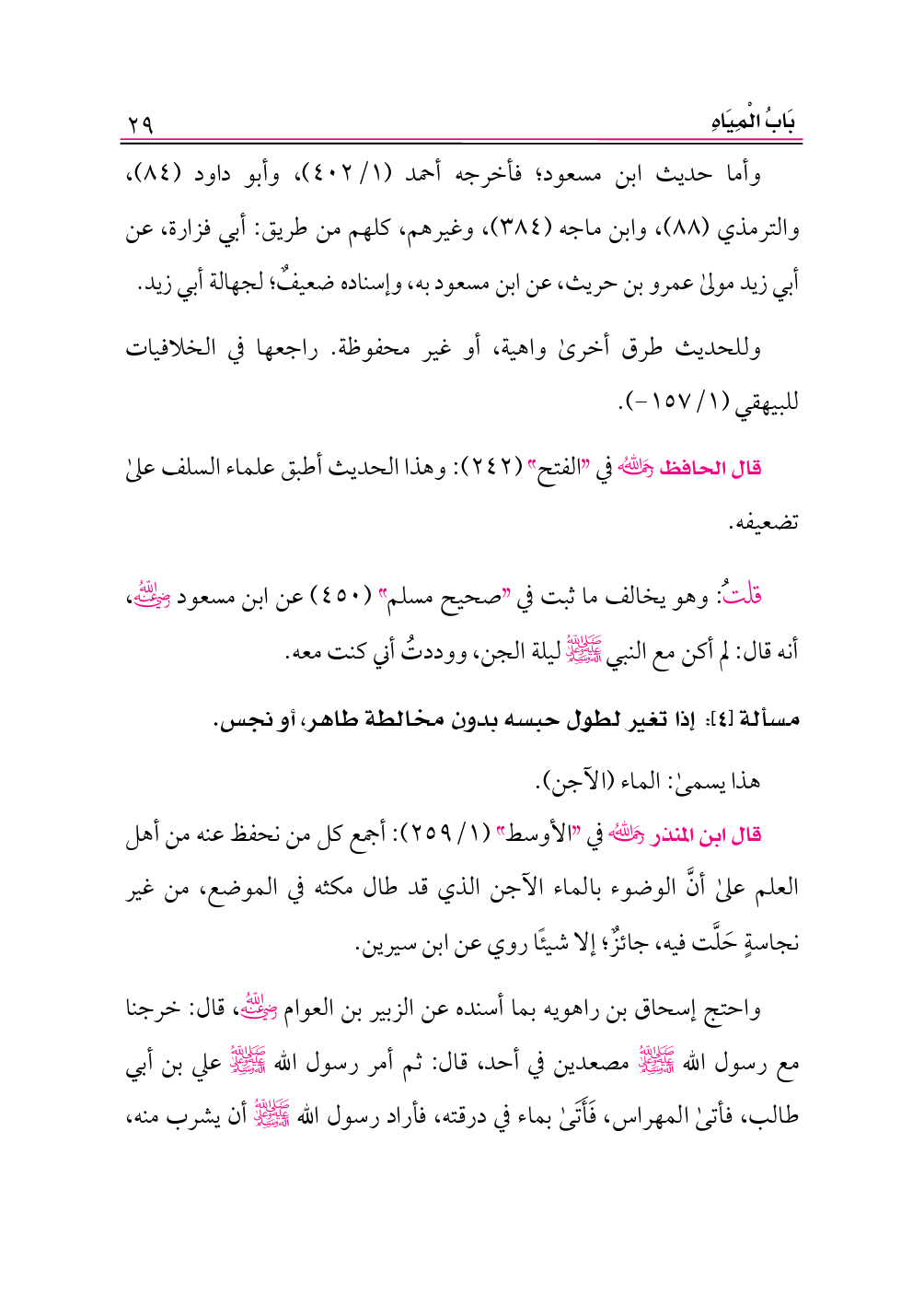 واحتج إسحاق بن راهويه بما أسنده عن الزبير بن العوام -رضي الله عنه-، قال: خرجنا مع رسول الله -صلى الله عليه وعلى آله وسلم- مصعدين في أحد، قال: ثم أمر رسول الله -صلى الله عليه وعلى آله وسلم- علي بن أبي طالب، فأتى المهراس، فَأَتَى بماء في درقته، فأراد رسول الله -صلى الله عليه وعلى آله وسلم- أن يشرب منه،