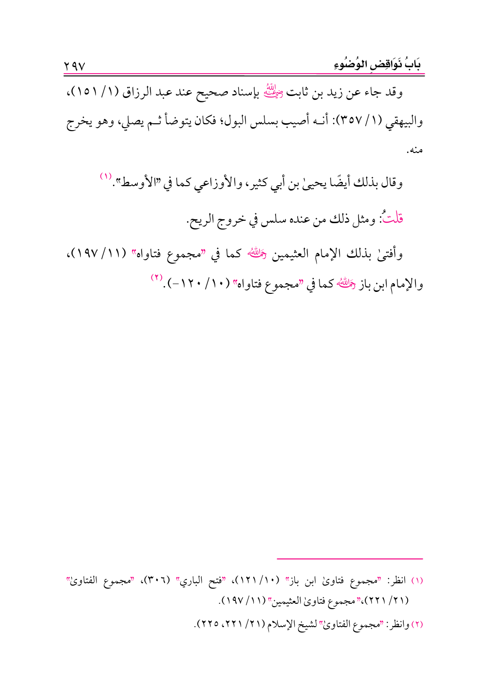 وقد جاء عن زيد بن ثابت -رضي الله عنه- بإسناد صحيح عند عبد الرزاق (١/ ١٥١)، والبيهقي (١/ ٣٥٧): أنه أصيب بسلس البول؛ فكان يتوضأ ثم يصلي، وهو يخرج منه.