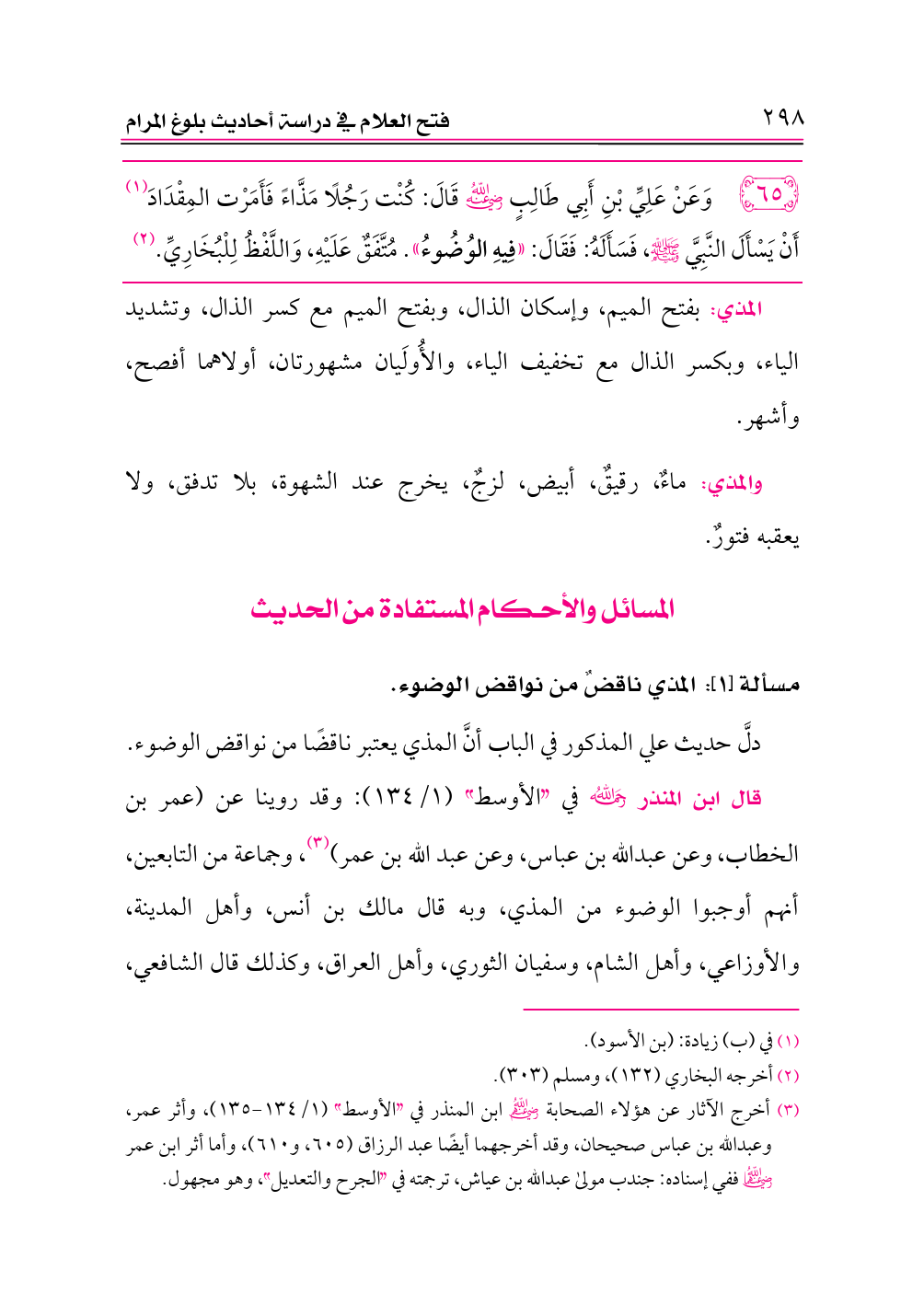٦٥ - وَعَنْ عَلِيِّ بْنِ أَبِي طَالِبٍ -رضي الله عنه- قَالَ: كُنْت رَجُلًا مَذَّاءً فَأَمَرْت المِقْدَادَ (¬١) أَنْ يَسْأَلَ النَّبِيَّ - صلى الله عليه وسلم -، فَسَأَلَهُ: فَقَالَ: «فِيهِ الوُضُوءُ». مُتَّفَقٌ عَلَيْهِ، وَاللَّفْظُ لِلْبُخَارِيِّ. (¬٢)