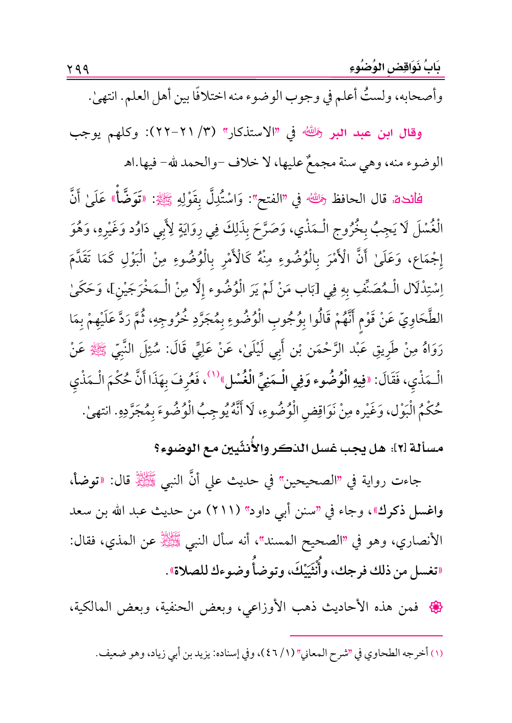 وقال ابن عبد البر -رحمه الله- في «الاستذكار» (٣/ ٢١ - ٢٢): وكلهم يوجب الوضوء منه، وهي سنة مجمعٌ عليها، لا خلاف -والحمد لله- فيها. اهـ