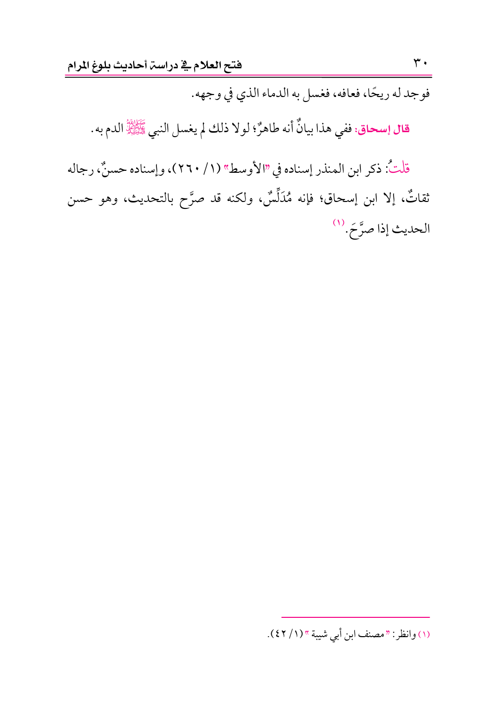 قلتُ: ذكر ابن المنذر إسناده في «الأوسط» (١/ ٢٦٠)، وإسناده حسنٌ، رجاله ثقاتٌ، إلا ابن إسحاق؛ فإنه مُدَلِّسٌ، ولكنه قد صرَّح بالتحديث، وهو حسن الحديث إذا صرَّحَ. (¬١)