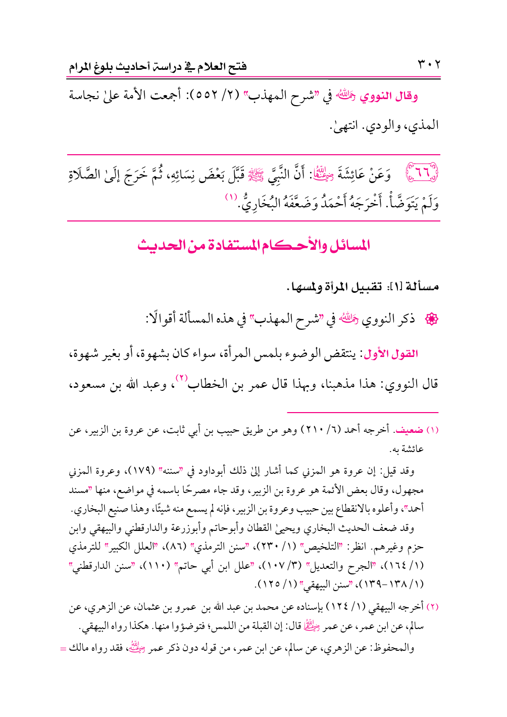 ٦٦ - وَعَنْ عَائِشَةَ -رضي الله عنها-: أَنَّ النَّبِيَّ - صلى الله عليه وسلم - قَبَّلَ بَعْضَ نِسَائِهِ، ثُمَّ خَرَجَ إلَى الصَّلَاةِ وَلَمْ يَتَوَضَّأْ. أَخْرَجَهُ أَحْمَدُ وَضَعَّفَهُ البُخَارِيُّ. (¬١)