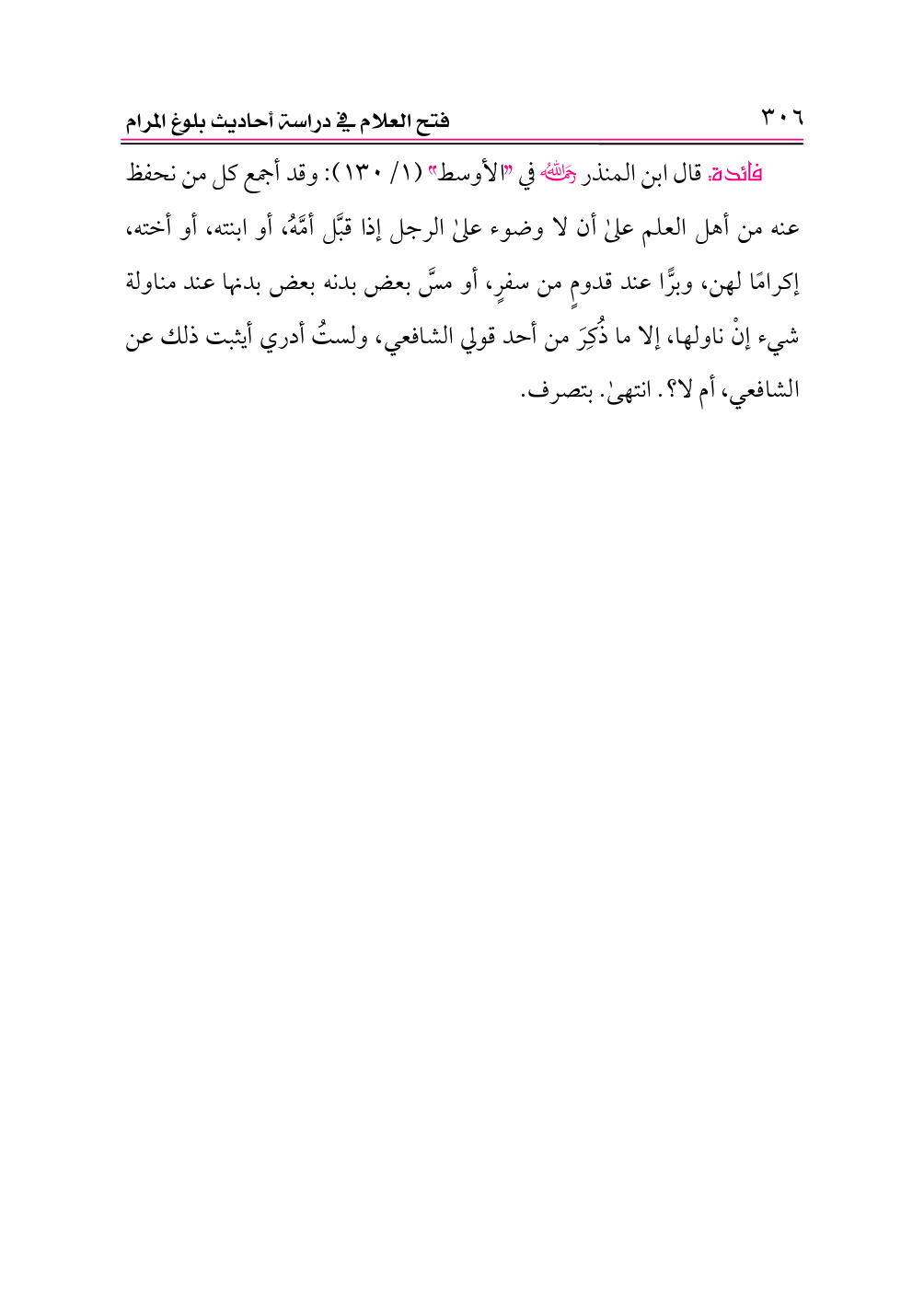 فائدة: قال ابن المنذر -رحمه الله- في «الأوسط» (١/ ١٣٠): وقد أجمع كل من نحفظ عنه من أهل العلم على أن لا وضوء على الرجل إذا قبَّل أمَّهُ، أو ابنته، أو أخته، إكرامًا لهن، وبرًّا عند قدومٍ من سفرٍ، أو مسَّ بعض بدنه بعض بدنها عند مناولة شيء إنْ ناولها، إلا ما ذُكِرَ من أحد قولي الشافعي، ولستُ أدري أيثبت ذلك عن الشافعي، أم لا؟. انتهى. بتصرف.