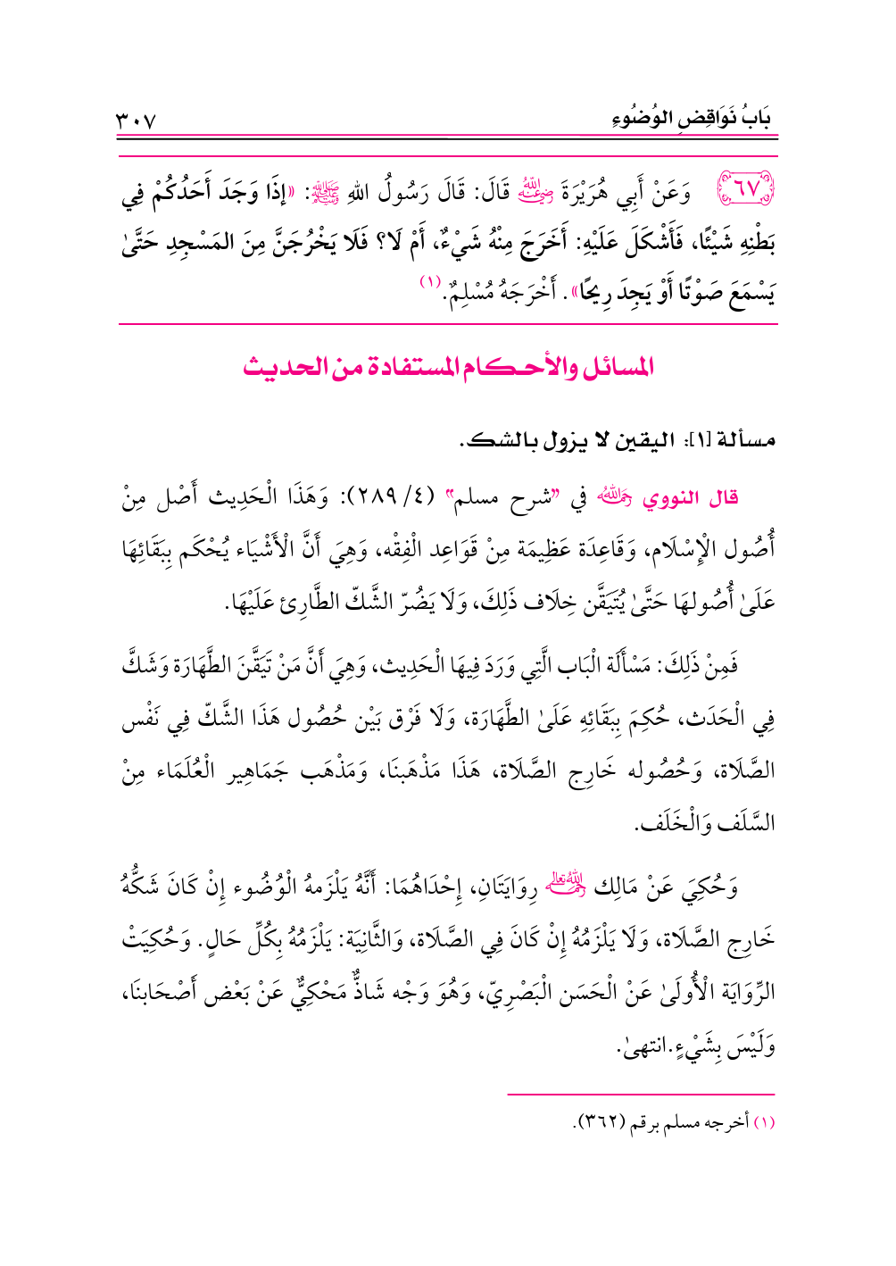 قال النووي -رحمه الله- في «شرح مسلم» (٤/ ٢٨٩): وَهَذَا الْحَدِيث أَصْل مِنْ أُصُول الْإِسْلَام، وَقَاعِدَة عَظِيمَة مِنْ قَوَاعِد الْفِقْه، وَهِيَ أَنَّ الْأَشْيَاء يُحْكَم بِبَقَائِهَا عَلَى أُصُولهَا حَتَّى يُتَيَقَّن خِلَاف ذَلِكَ، وَلَا يَضُرّ الشَّكّ الطَّارِئ عَلَيْهَا.