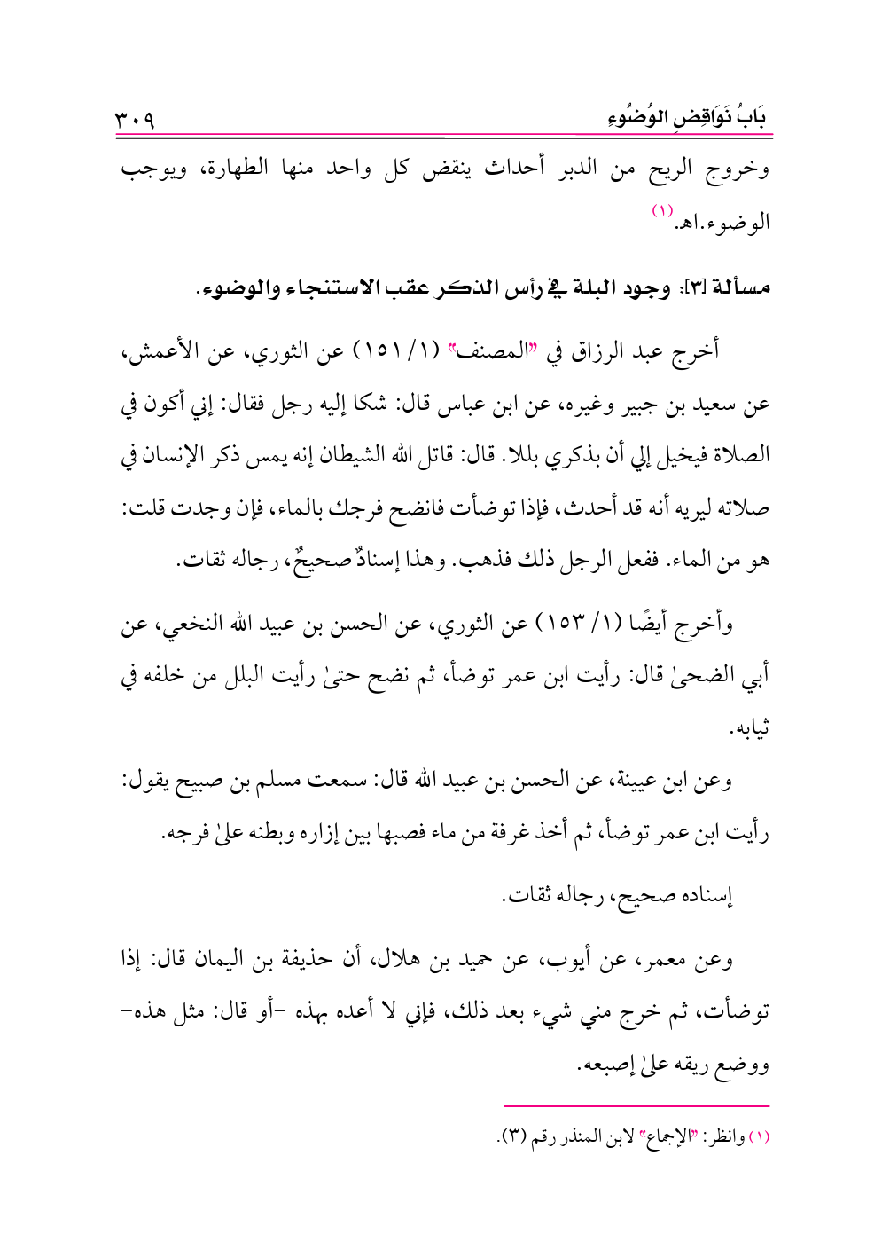 وأخرج أيضًا (١/ ١٥٣) عن الثوري، عن الحسن بن عبيد الله النخعي، عن أبي الضحى قال: رأيت ابن عمر توضأ، ثم نضح حتى رأيت البلل من خلفه في ثيابه.