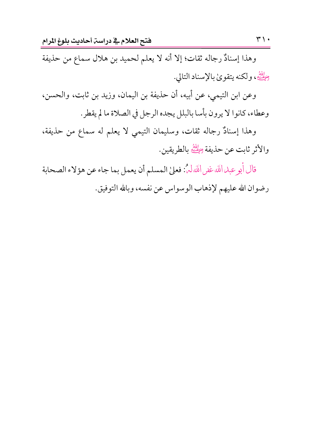وهذا إسنادٌ رجاله ثقات؛ إلا أنه لا يعلم لحميد بن هلال سماع من حذيفة -رضي الله عنه-، ولكنه يتقوى بالإسناد التالي.