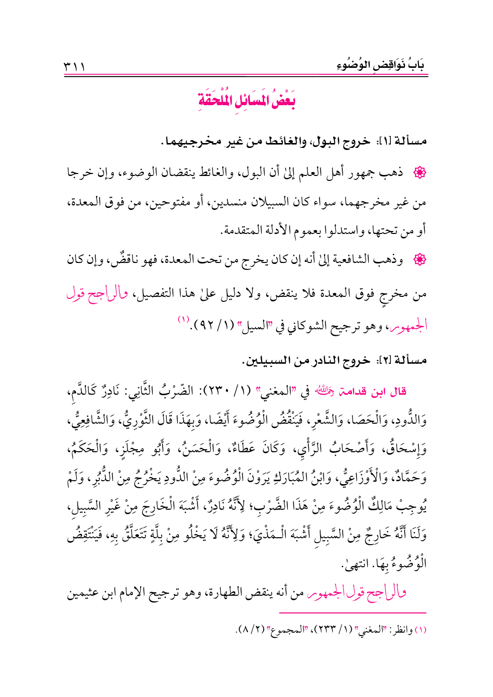 • وذهب الشافعية إلى أنه إن كان يخرج من تحت المعدة، فهو ناقضٌ، وإن كان من مخرجٍ فوق المعدة فلا ينقض، ولا دليل على هذا التفصيل، والراجح قول الجمهور، وهو ترجيح الشوكاني في «السيل» (١/ ٩٢). (¬١)
