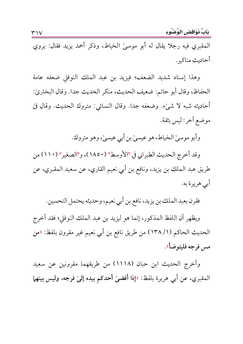 ويظهر أن اللفظ المذكور، إنما هو ليزيد بن عبد الملك النوفلي؛ فقد أخرج الحديث الحاكم (١/ ١٣٨) من طريق نافع بن أبي نعيم غير مقرون بلفظ: «من مس فرجه فليتوضأ».