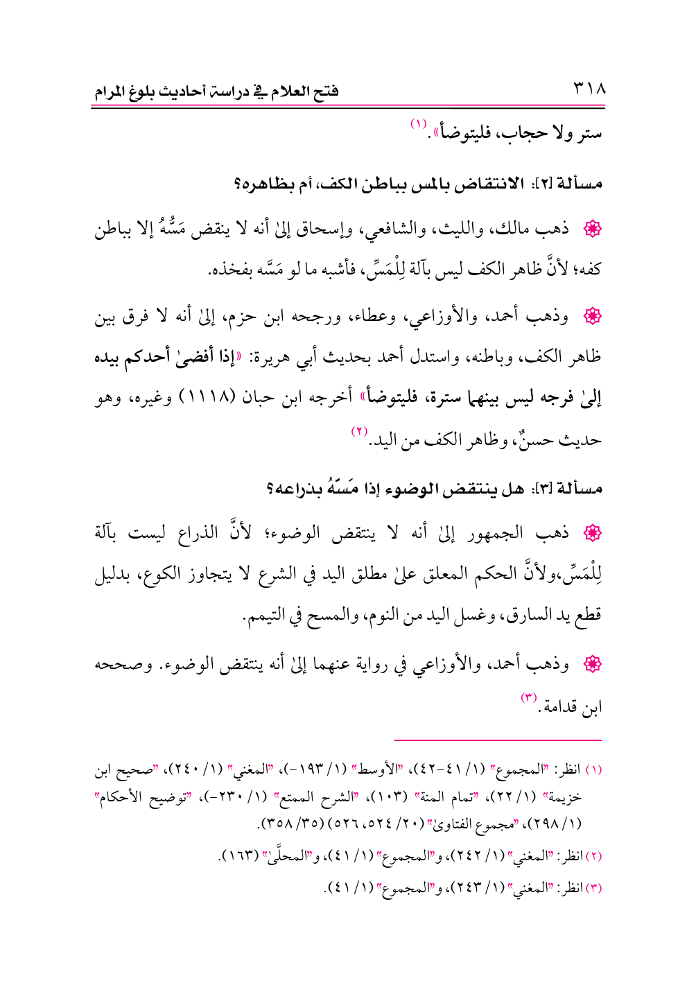 • وذهب أحمد، والأوزاعي، وعطاء، ورجحه ابن حزم، إلى أنه لا فرق بين ظاهر الكف، وباطنه، واستدل أحمد بحديث أبي هريرة: «إذا أفضى أحدكم بيده إلى فرجه ليس بينهما سترة، فليتوضأ» أخرجه ابن حبان (١١١٨) وغيره، وهو حديث حسنٌ، وظاهر الكف من اليد. (¬٢)