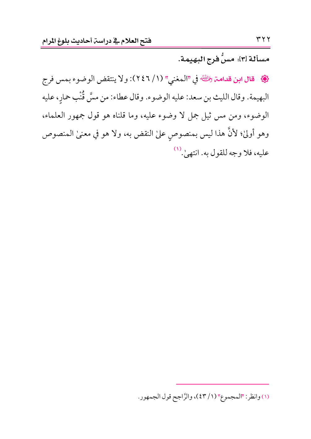 • قال ابن قدامة -رحمه الله- في «المغني» (١/ ٢٤٦): ولا ينتقض الوضوء بمس فرج البهيمة. وقال الليث بن سعد: عليه الوضوء. وقال عطاء: من مسَّ قُنْب حمارٍ، عليه الوضوء، ومن مس ثيل جمل لا وضوء عليه، وما قلناه هو قول جمهور العلماء، وهو أولى؛ لأنَّ هذا ليس بمنصوصٍ على النقض به، ولا هو في معنى المنصوص عليه، فلا وجه للقول به. انتهى. (¬١)