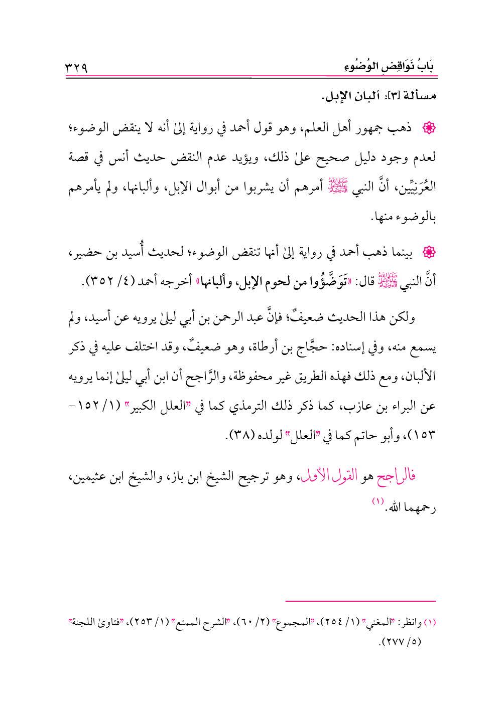 ولكن هذا الحديث ضعيفٌ؛ فإنَّ عبد الرحمن بن أبي ليلى يرويه عن أسيد، ولم يسمع منه، وفي إسناده: حجَّاج بن أرطاة، وهو ضعيفٌ، وقد اختلف عليه في ذكر الألبان، ومع ذلك فهذه الطريق غير محفوظة، والرَّاجح أن ابن أبي ليلى إنما يرويه عن البراء بن عازب، كما ذكر ذلك الترمذي كما في «العلل الكبير» (١/ ١٥٢ - ١٥٣)، وأبو حاتم كما في «العلل» لولده (٣٨).
