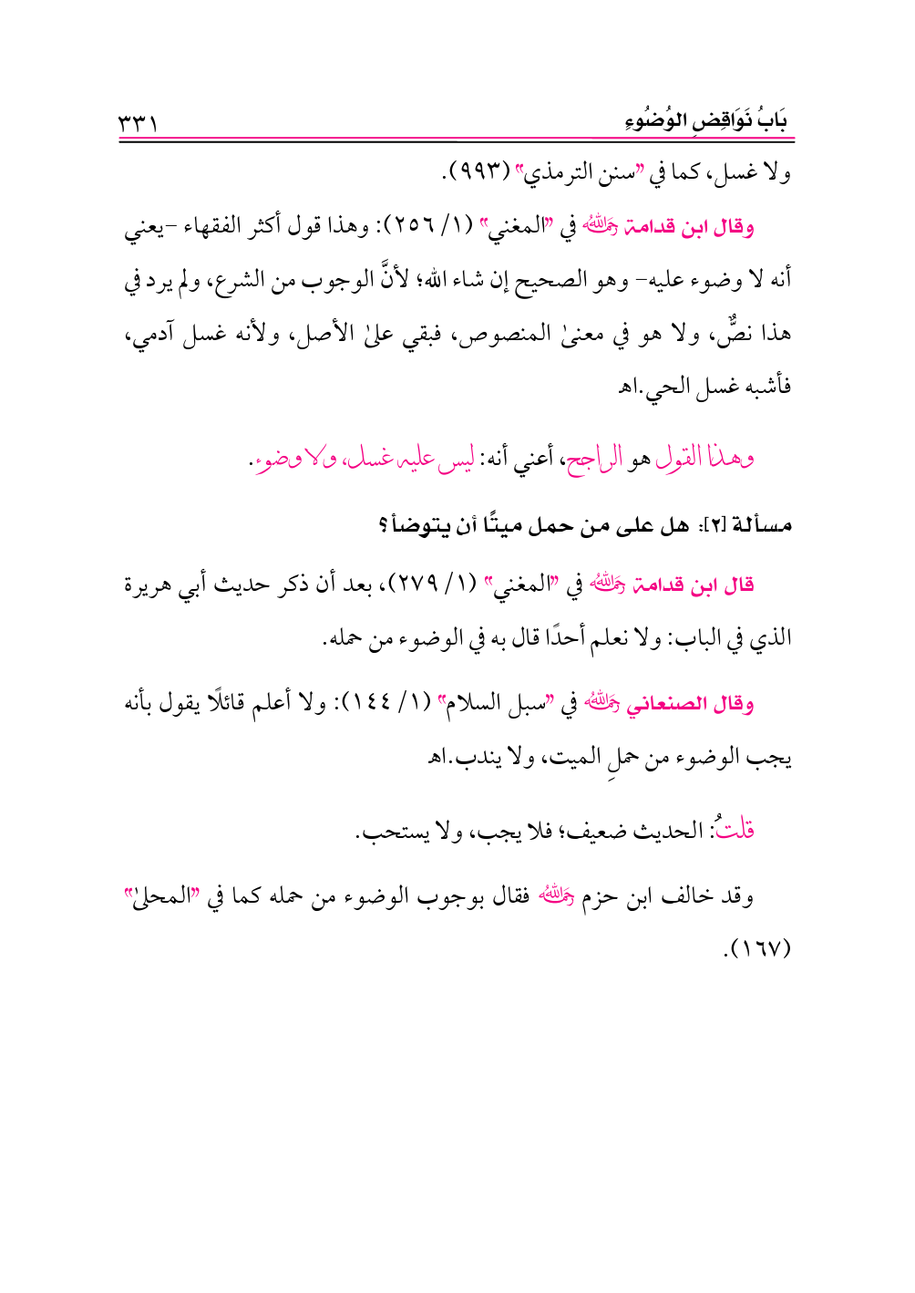 وقال الصنعاني -رحمه الله- في «سبل السلام» (١/ ١٤٤): ولا أعلم قائلًا يقول بأنه يجب الوضوء من حملِ الميت، ولا يندب. اهـ