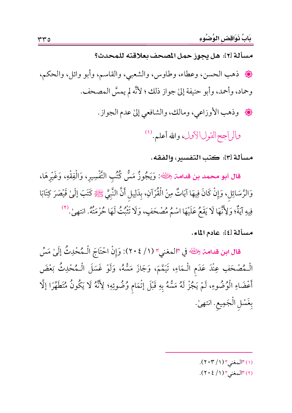 قال أبو محمد بن قدامة -رحمه الله-: وَيَجُوزُ مَسُّ كُتُبِ التَّفْسِيرِ، وَالْفِقْهِ، وَغَيْرِهَا، وَالرَّسَائِلِ، وَإِنْ كَانَ فِيهَا آيَاتٌ مِنْ الْقُرْآنِ، بِدَلِيلِ أَنَّ النَّبِيَّ - صلى الله عليه وسلم - كَتَبَ إلَى قَيْصَرَ كِتَابًا فِيهِ آيَةٌ؛ وَلِأَنَّهَا لَا يَقَعُ عَلَيْهَا اسْمُ مُصْحَفٍ، وَلَا تَثْبُتُ لَهَا حُرْمَتُهُ. انتهى. (¬٢)