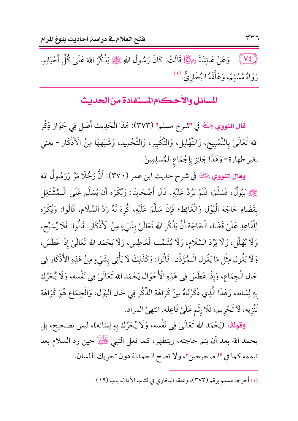 وقال النووي -رحمه الله- في شرح حديث ابن عمر (٣٧٠): أَنَّ رَجُلًا مَرَّ وَرَسُولُ الله - صلى الله عليه وسلم - يَبُولُ، فَسَلَّمَ، فَلَمْ يَرُدَّ عَلَيْهِ. قَالَ أَصْحَابنَا: وَيُكْرَه أَنْ يُسَلِّم عَلَى الْمُشْتَغِل بِقَضَاءِ حَاجَة الْبَوْل وَالْغَائِط؛ فَإِنْ سَلَّمَ عَلَيْهِ، كُرِهَ لَهُ رَدّ السَّلَام، قَالُوا: وَيُكْرَه لِلْقَاعِدِ عَلَى قَضَاء الْحَاجَة أَنْ يَذْكُر الله تَعَالَى بِشَيْءٍ مِنْ الْأَذْكَار. قَالُوا: فَلَا يُسَبِّح، وَلَا يُهَلِّل، وَلَا يَرُدّ السَّلَام، وَلَا يُشَمِّت الْعَاطِس، وَلَا يَحْمَد الله تَعَالَى إِذَا عَطَسَ، وَلَا يَقُول مِثْل مَا يَقُول الْمُؤَذِّن. قَالُوا: وَكَذَلِكَ لَا يَأْتِي بِشَيْءٍ مِنْ هَذِهِ الْأَذْكَار فِي حَال الْجِمَاع، وَإِذَا عَطَسَ فِي هَذِهِ الْأَحْوَال يَحْمَد الله تَعَالَى فِي نَفْسه، وَلَا يُحَرِّك بِهِ لِسَانه، وَهَذَا الَّذِي ذَكَرْنَاهُ مِنْ كَرَاهَة الذِّكْر فِي حَال الْبَوْل، وَالْجِمَاع هُوَ كَرَاهَة تَنْزِيه، لَا تَحْرِيم، فَلَا إِثْم عَلَى فَاعِله. انتهى المراد.