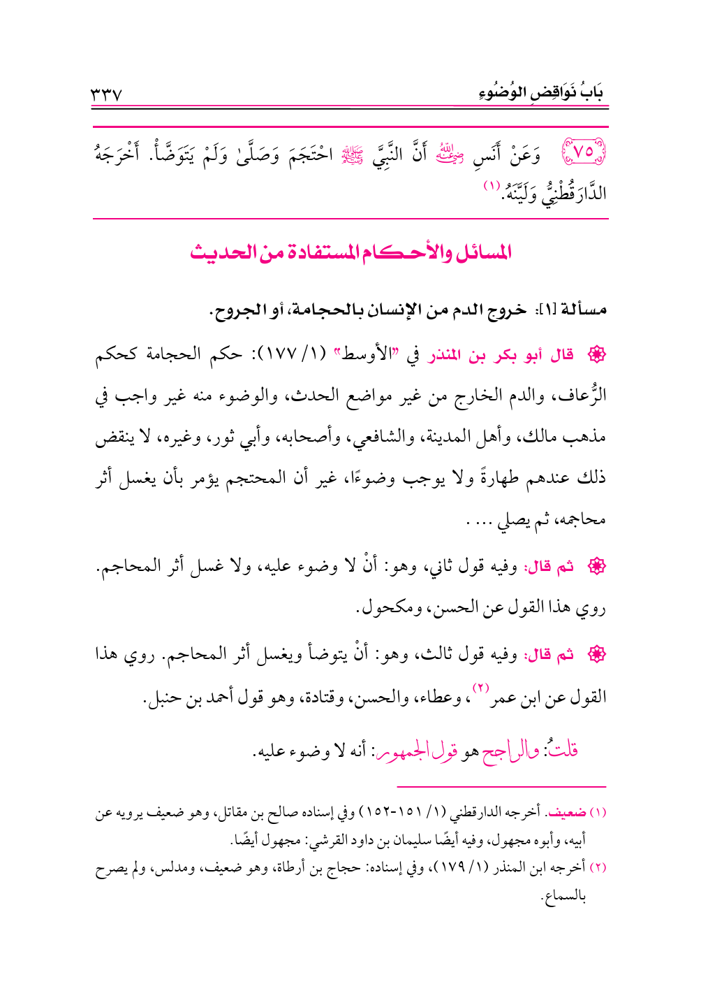 ٧٥ - وَعَنْ أَنَسِ -رضي الله عنه- أَنَّ النَّبِيَّ - صلى الله عليه وسلم - احْتَجَمَ وَصَلَّى وَلَمْ يَتَوَضَّأْ. أَخْرَجَهُ الدَّارَقُطْنِيُّ وَلَيَّنَهُ. (¬١)