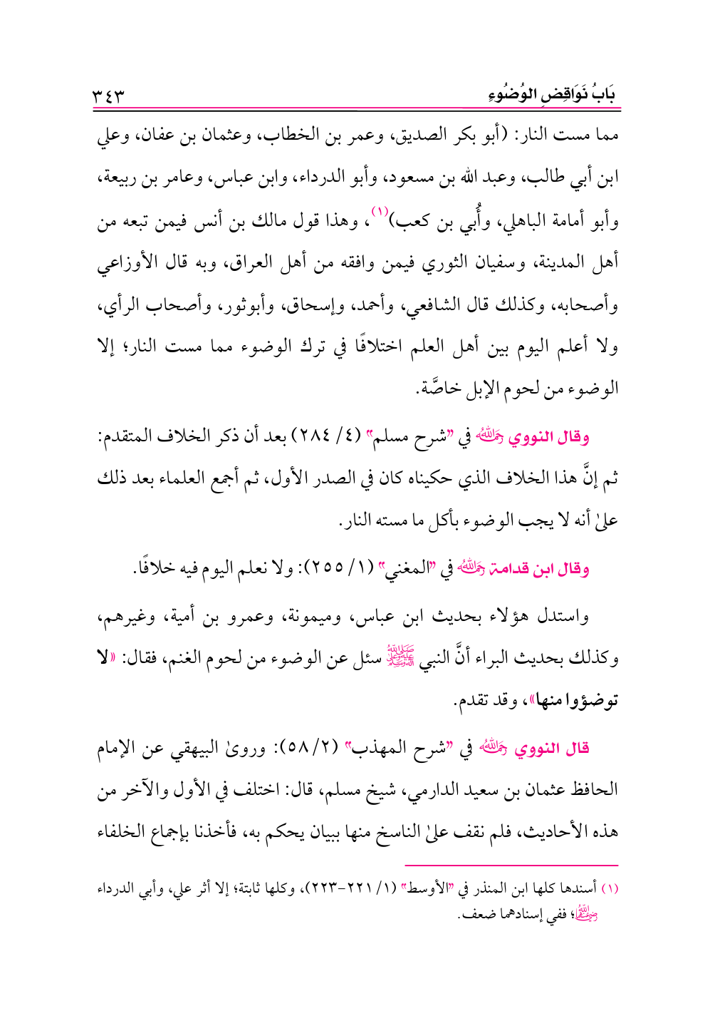 وقال النووي -رحمه الله- في «شرح مسلم» (٤/ ٢٨٤) بعد أن ذكر الخلاف المتقدم: ثم إنَّ هذا الخلاف الذي حكيناه كان في الصدر الأول، ثم أجمع العلماء بعد ذلك على أنه لا يجب الوضوء بأكل ما مسته النار.
