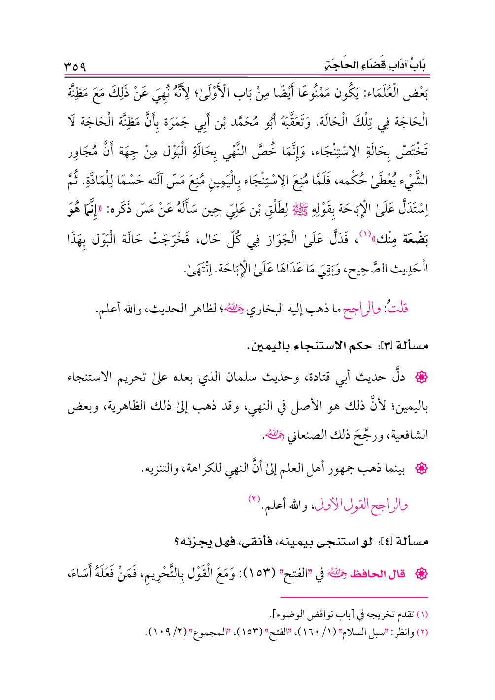 مسألة [٣]: حكم الاستنجاء باليمين.