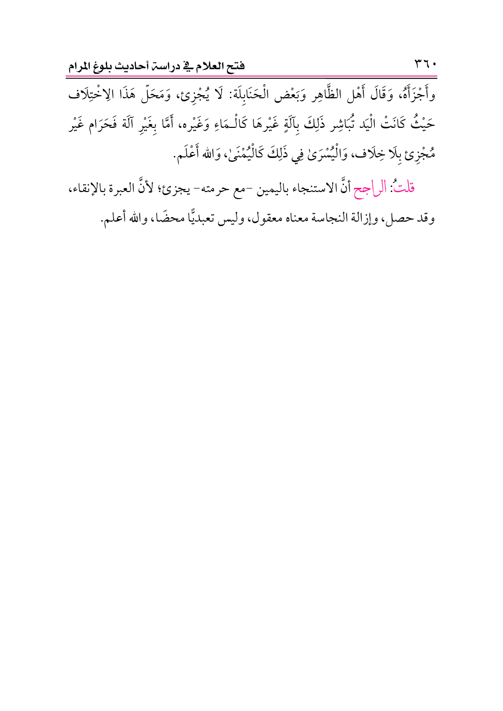 قلتُ: الراجح أنَّ الاستنجاء باليمين -مع حرمته- يجزئ؛ لأنَّ العبرة بالإنقاء، وقد حصل، وإزالة النجاسة معناه معقول، وليس تعبديًّا محضًا، والله أعلم.