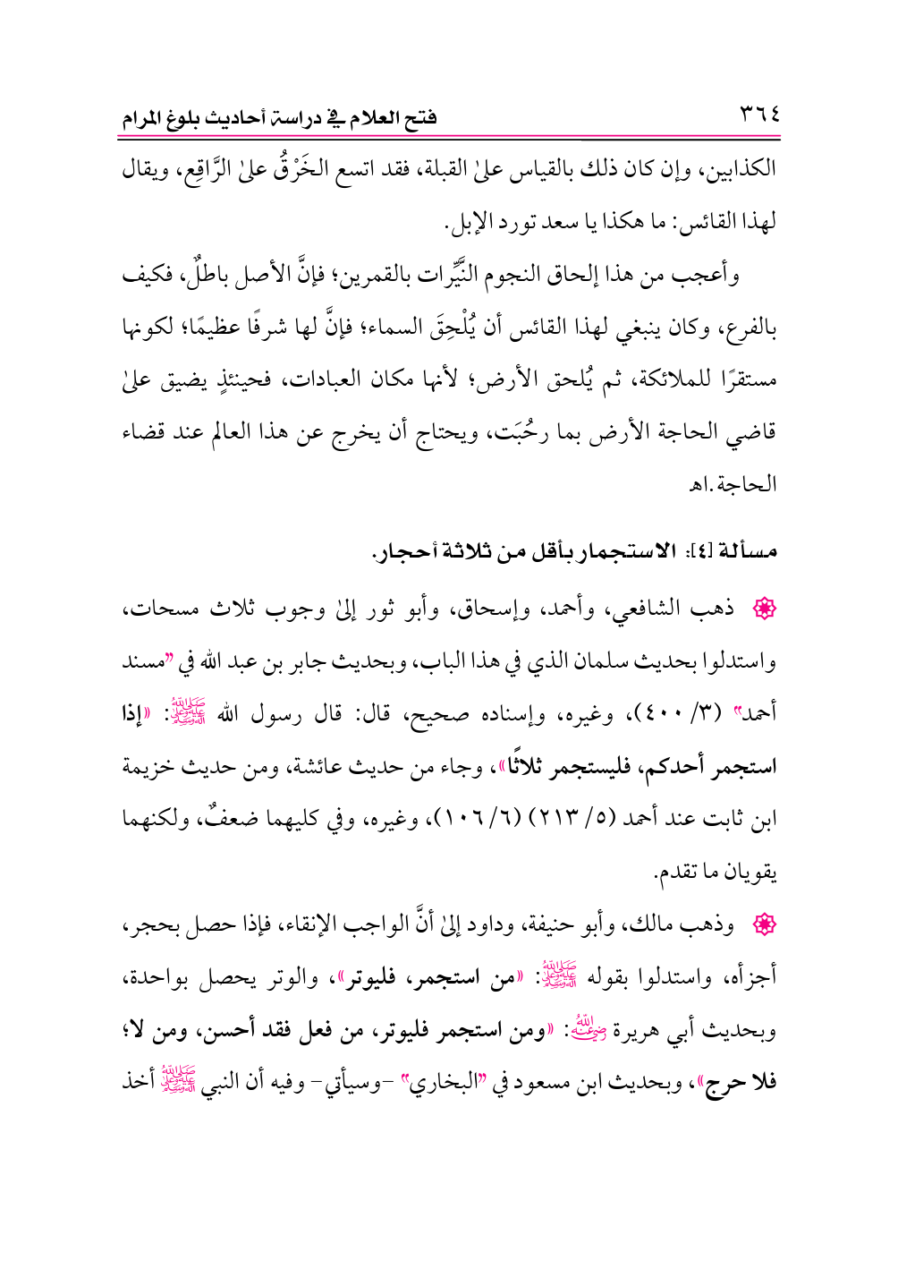 وأعجب من هذا إلحاق النجوم النَّيِّرات بالقمرين؛ فإنَّ الأصل باطلٌ، فكيف بالفرع، وكان ينبغي لهذا القائس أن يُلْحِقَ السماء؛ فإنَّ لها شرفًا عظيمًا؛ لكونها مستقرًا للملائكة، ثم يُلحق الأرض؛ لأنها مكان العبادات، فحينئذٍ يضيق على قاضي الحاجة الأرض بما رحُبَت، ويحتاج أن يخرج عن هذا العالم عند قضاء الحاجة. اهـ