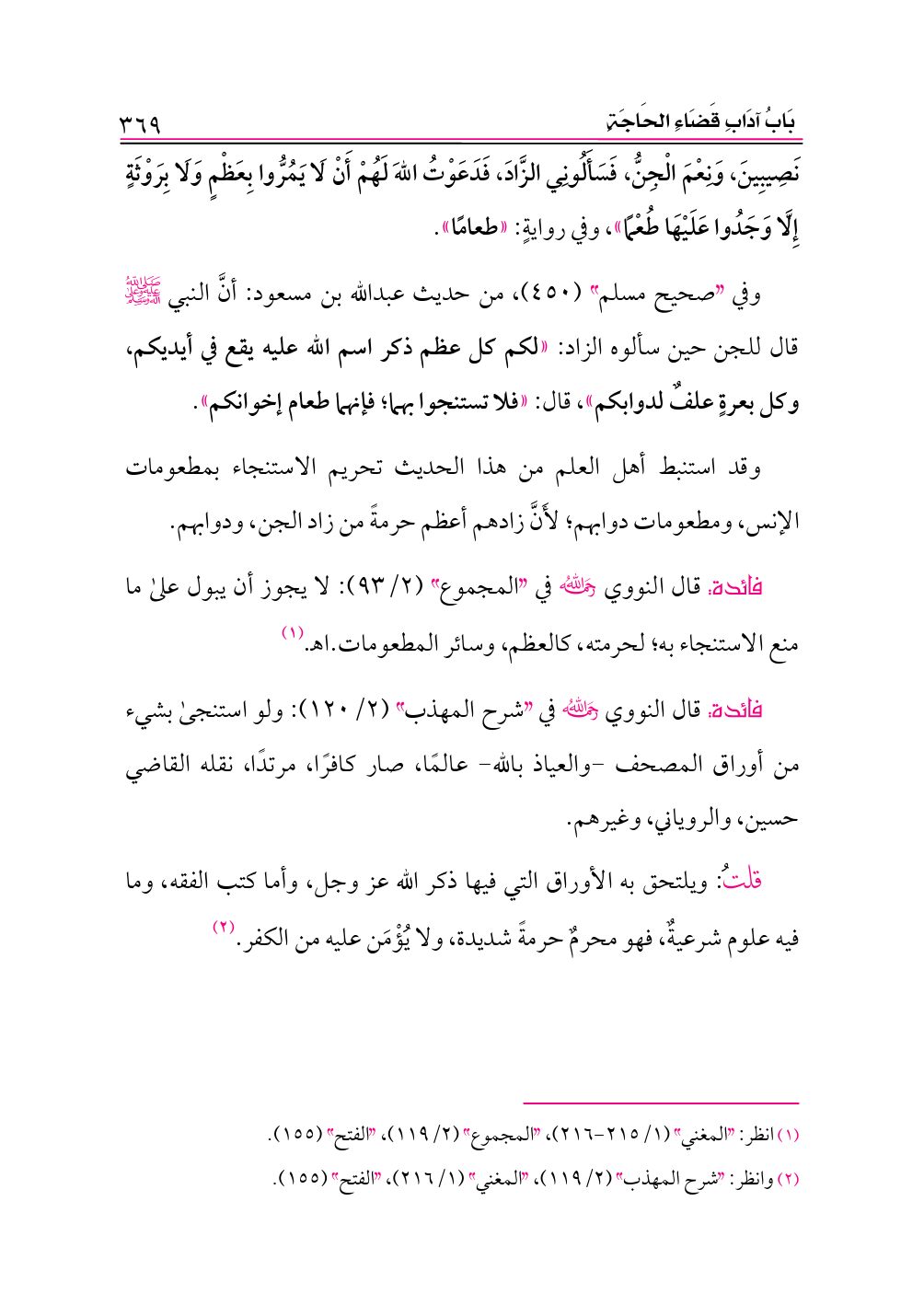 قلتُ: ويلتحق به الأوراق التي فيها ذكر الله عز وجل، وأما كتب الفقه، وما فيه علوم شرعيةٌ، فهو محرمٌ حرمةً شديدة، ولا يُؤْمَن عليه من الكفر. (¬٢)