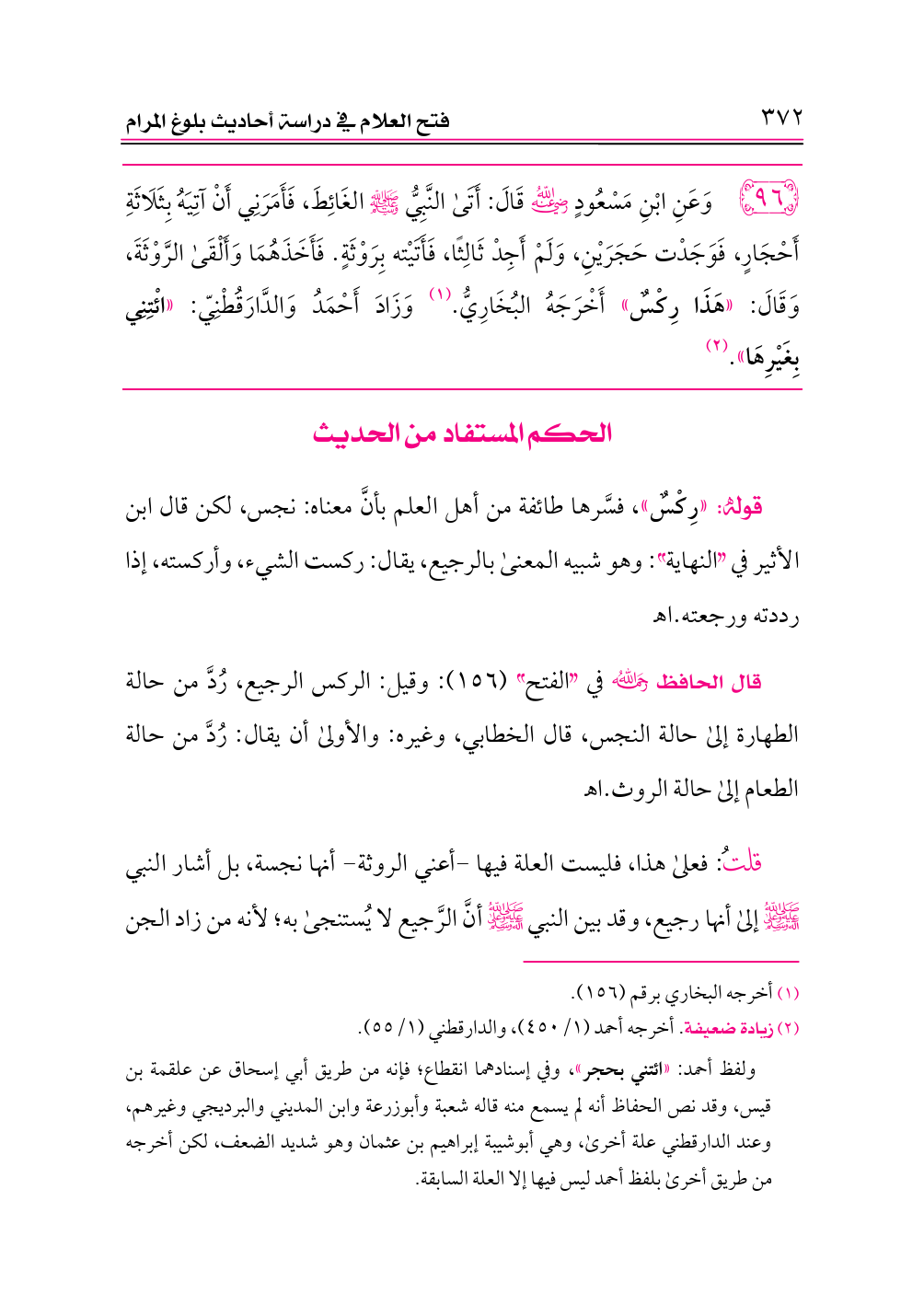 ٩٦ - وَعَنِ ابْنِ مَسْعُودٍ -رضي الله عنه- قَالَ: أَتَى النَّبِيُّ - صلى الله عليه وسلم - الغَائِطَ، فَأَمَرَنِي أَنْ آتِيَهُ بِثَلَاثَةِ أَحْجَارٍ، فَوَجَدْت حَجَرَيْنِ، وَلَمْ أَجِدْ ثَالِثًا، فَأَتَيْته بِرَوْثَةٍ. فَأَخَذَهُمَا وَأَلْقَى الرَّوْثَةَ، وَقَالَ: «هَذَا رِكْسٌ» أَخْرَجَهُ البُخَارِيُّ. (¬١) وَزَادَ أَحْمَدُ وَالدَّارَقُطْنِيّ: «ائْتِنِي بِغَيْرِهَا». (¬٢)