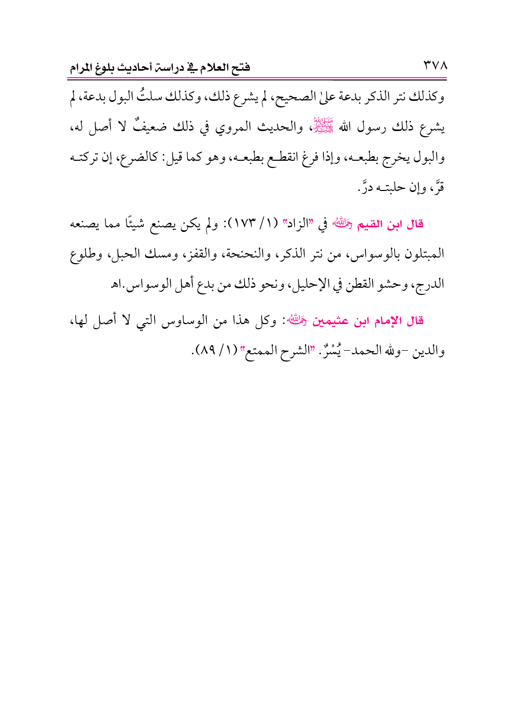 وكذلك نتر الذكر بدعة على الصحيح، لم يشرع ذلك، وكذلك سلتُ البول بدعة، لم يشرع ذلك رسول الله -صلى الله عليه وعلى آله وسلم-، والحديث المروي في ذلك ضعيفٌ لا أصل له، والبول يخرج بطبعه، وإذا فرغ انقطع بطبعه، وهو كما قيل: كالضرع، إن تركته قرَّ، وإن حلبته درَّ.