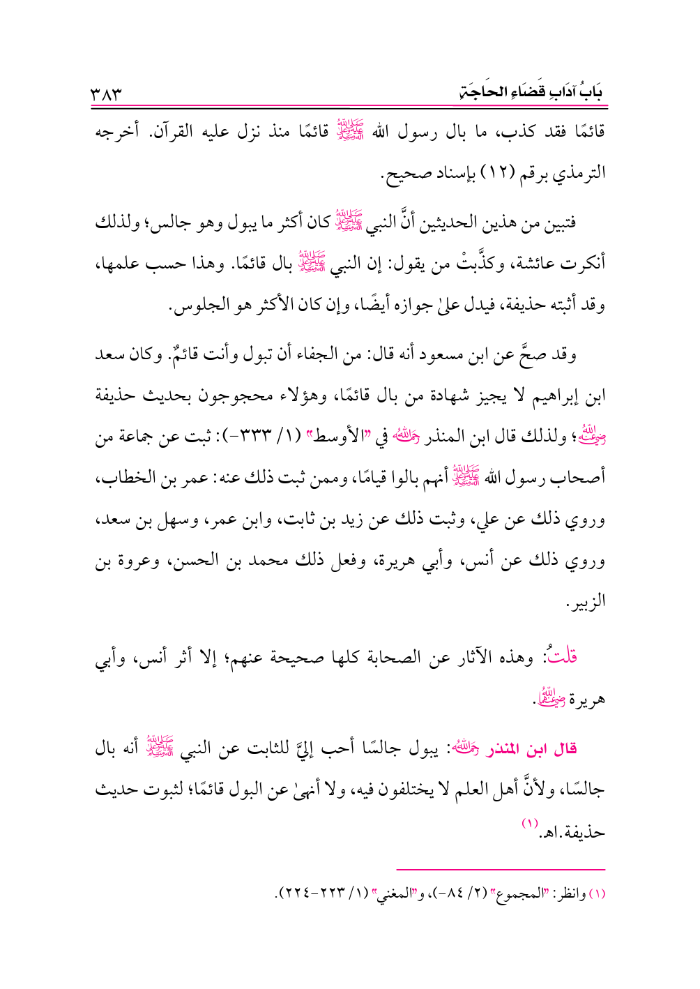 وقد صحَّ عن ابن مسعود أنه قال: من الجفاء أن تبول وأنت قائمٌ. وكان سعد ابن إبراهيم لا يجيز شهادة من بال قائمًا، وهؤلاء محجوجون بحديث حذيفة -رضي الله عنه-؛ ولذلك قال ابن المنذر -رحمه الله- في «الأوسط» (١/ ٣٣٣ - ): ثبت عن جماعة من أصحاب رسول الله -صلى الله عليه وعلى آله وسلم- أنهم بالوا قيامًا، وممن ثبت ذلك عنه: عمر بن الخطاب، وروي ذلك عن علي، وثبت ذلك عن زيد بن ثابت، وابن عمر، وسهل بن سعد، وروي ذلك عن أنس، وأبي هريرة، وفعل ذلك محمد بن الحسن، وعروة بن الزبير.