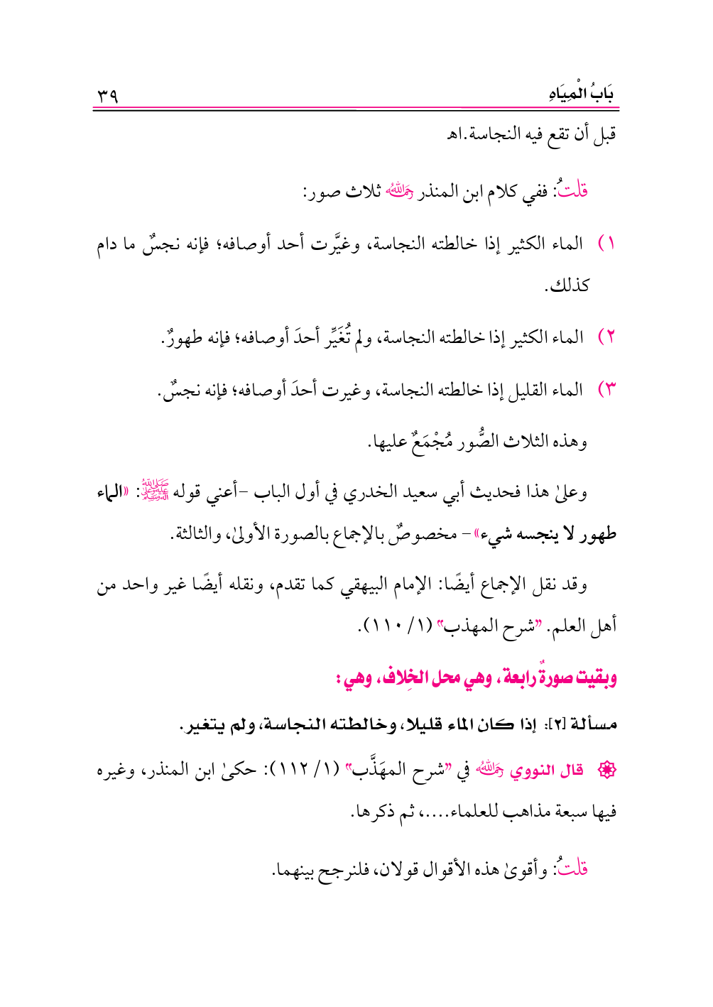 وعلى هذا فحديث أبي سعيد الخدري في أول الباب -أعني قوله -صلى الله عليه وعلى آله وسلم-: «الماء طهور لا ينجسه شيء» - مخصوصٌ بالإجماع بالصورة الأولى، والثالثة.