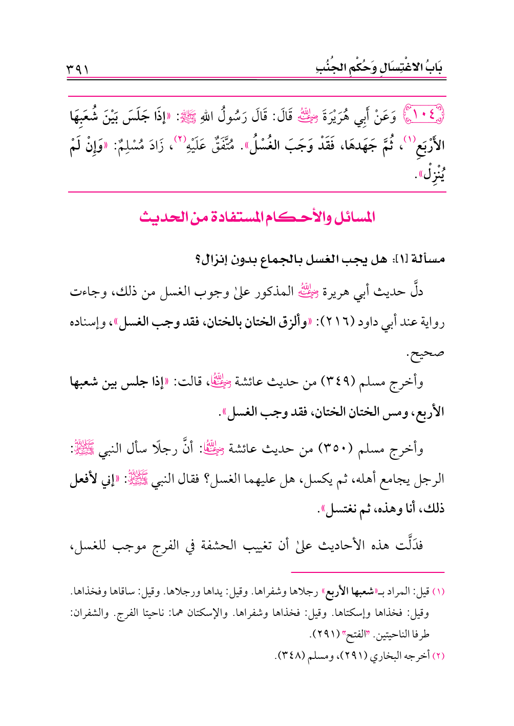 ١٠٤ - وَعَنْ أَبِي هُرَيْرَةَ -رضي الله عنه- قَالَ: قَالَ رَسُولُ اللهِ - صلى الله عليه وسلم -: «إذَا جَلَسَ بَيْنَ شُعَبِهَا الأَرْبَعِ (¬١)، ثُمَّ جَهَدهَا، فَقَدْ وَجَبَ الغُسْلُ». مُتَّفَقٌ عَلَيْهِ (¬٢)، زَادَ مُسْلِمٌ: «وَإِنْ لَمْ يُنْزِلْ».