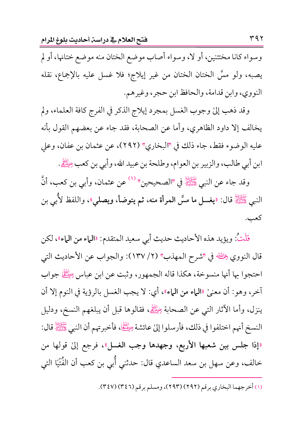 قلتُ: ويؤيد هذه الأحاديث حديث أبي سعيد المتقدم: «الماء من الماء»، لكن قال النووي -رحمه الله- في «شرح المهذب» (٢/ ١٣٧): والجواب عن الأحاديث التي احتجوا بها أنها منسوخة، هكذا قاله الجمهور، وثبت عن ابن عباس -رضي الله عنهما- جواب آخر، وهو: أن معنى «الماء من الماء»، أي: لا يجب الغسل بالرؤية في النوم إلا أن ينزل، وأما الآثار التي عن الصحابة -رضي الله عنهم-، فقالوها قبل أن يبلغهم النسخ، ودليل النسخ أنهم اختلفوا في ذلك، فأرسلوا إلى عائشة -رضي الله عنها-، فأخبرتهم أن النبي -صلى الله عليه وعلى آله وسلم- قال: «إذا جلس بين شعبها الأربع، وجهدها وجب الغسل»، فرجع إلى قولها من خالف، وعن سهل بن سعد الساعدي قال: حدثني أُبي بن كعب أن الفُتْيَا التي