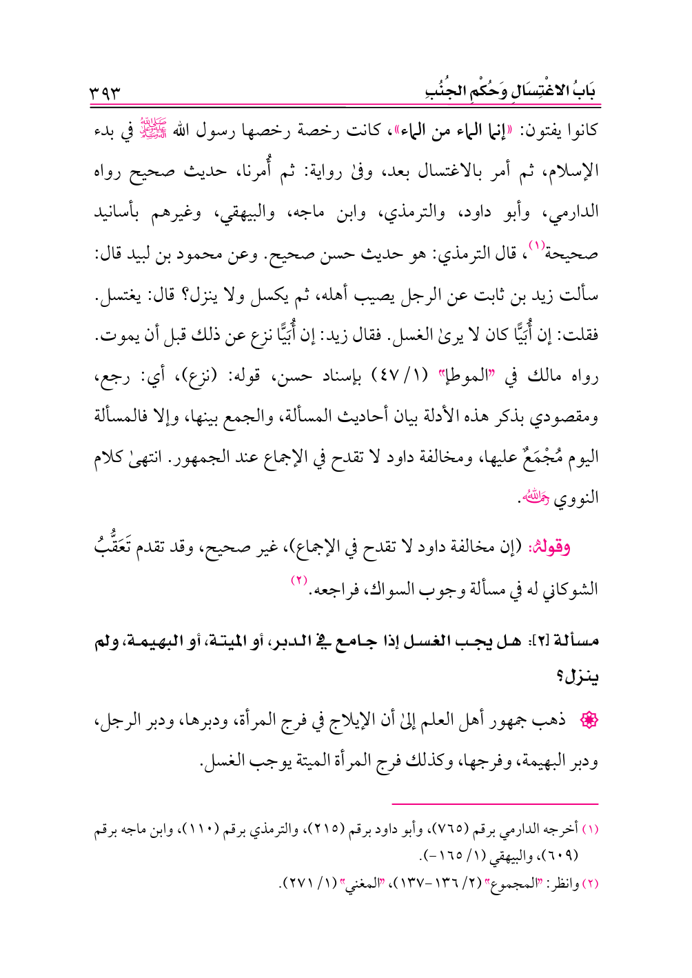 كانوا يفتون: «إنما الماء من الماء»، كانت رخصة رخصها رسول الله -صلى الله عليه وعلى آله وسلم- في بدء الإسلام، ثم أمر بالاغتسال بعد، وفى رواية: ثم أُمرنا، حديث صحيح رواه الدارمي، وأبو داود، والترمذي، وابن ماجه، والبيهقي، وغيرهم بأسانيد صحيحة (¬١)، قال الترمذي: هو حديث حسن صحيح. وعن محمود بن لبيد قال: سألت زيد بن ثابت عن الرجل يصيب أهله، ثم يكسل ولا ينزل؟ قال: يغتسل. فقلت: إن أُبَيًّا كان لا يرى الغسل. فقال زيد: إن أُبَيًّا نزع عن ذلك قبل أن يموت. رواه مالك في «الموطإ» (١/ ٤٧) بإسناد حسن، قوله: (نزع)، أي: رجع، ومقصودي بذكر هذه الأدلة بيان أحاديث المسألة، والجمع بينها، وإلا فالمسألة اليوم مُجْمَعٌ عليها، ومخالفة داود لا تقدح في الإجماع عند الجمهور. انتهى كلام النووي -رحمه الله-.