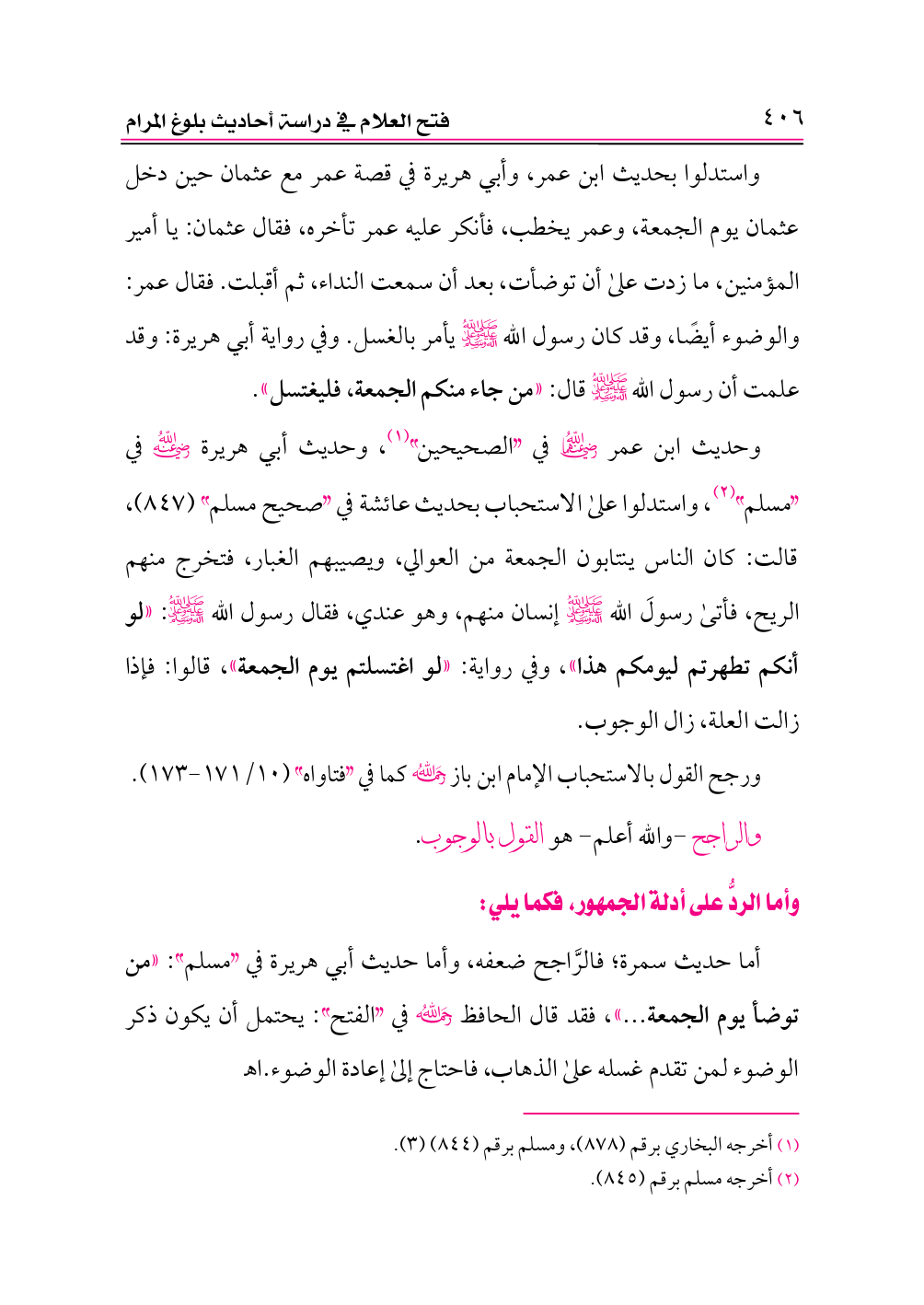 واستدلوا بحديث ابن عمر، وأبي هريرة في قصة عمر مع عثمان حين دخل عثمان يوم الجمعة، وعمر يخطب، فأنكر عليه عمر تأخره، فقال عثمان: يا أمير المؤمنين، ما زدت على أن توضأت، بعد أن سمعت النداء، ثم أقبلت. فقال عمر: والوضوء أيضًا، وقد كان رسول الله -صلى الله عليه وعلى آله وسلم- يأمر بالغسل. وفي رواية أبي هريرة: وقد علمت أن رسول الله -صلى الله عليه وعلى آله وسلم- قال: «من جاء منكم الجمعة، فليغتسل».