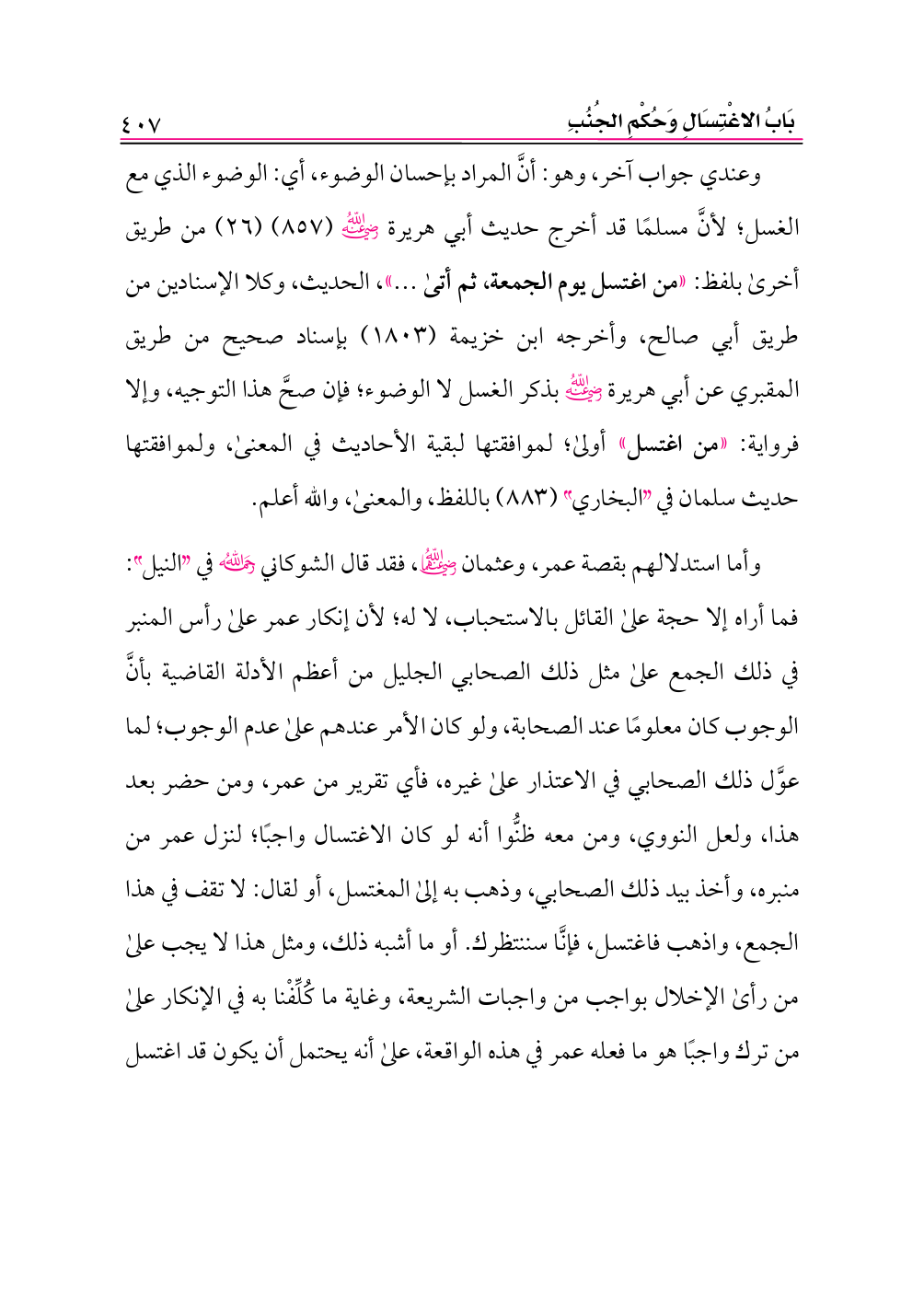 وأما استدلالهم بقصة عمر، وعثمان -رضي الله عنهما-، فقد قال الشوكاني -رحمه الله- في «النيل»: فما أراه إلا حجة على القائل بالاستحباب، لا له؛ لأن إنكار عمر على رأس المنبر في ذلك الجمع على مثل ذلك الصحابي الجليل من أعظم الأدلة القاضية بأنَّ الوجوب كان معلومًا عند الصحابة، ولو كان الأمر عندهم على عدم الوجوب؛ لما عوَّل ذلك الصحابي في الاعتذار على غيره، فأي تقرير من عمر، ومن حضر بعد هذا، ولعل النووي، ومن معه ظنُّوا أنه لو كان الاغتسال واجبًا؛ لنزل عمر من منبره، وأخذ بيد ذلك الصحابي، وذهب به إلى المغتسل، أو لقال: لا تقف في هذا الجمع، واذهب فاغتسل، فإنَّا سننتظرك. أو ما أشبه ذلك، ومثل هذا لا يجب على من رأى الإخلال بواجب من واجبات الشريعة، وغاية ما كُلِّفْنا به في الإنكار على من ترك واجبًا هو ما فعله عمر في هذه الواقعة، على أنه يحتمل أن يكون قد اغتسل