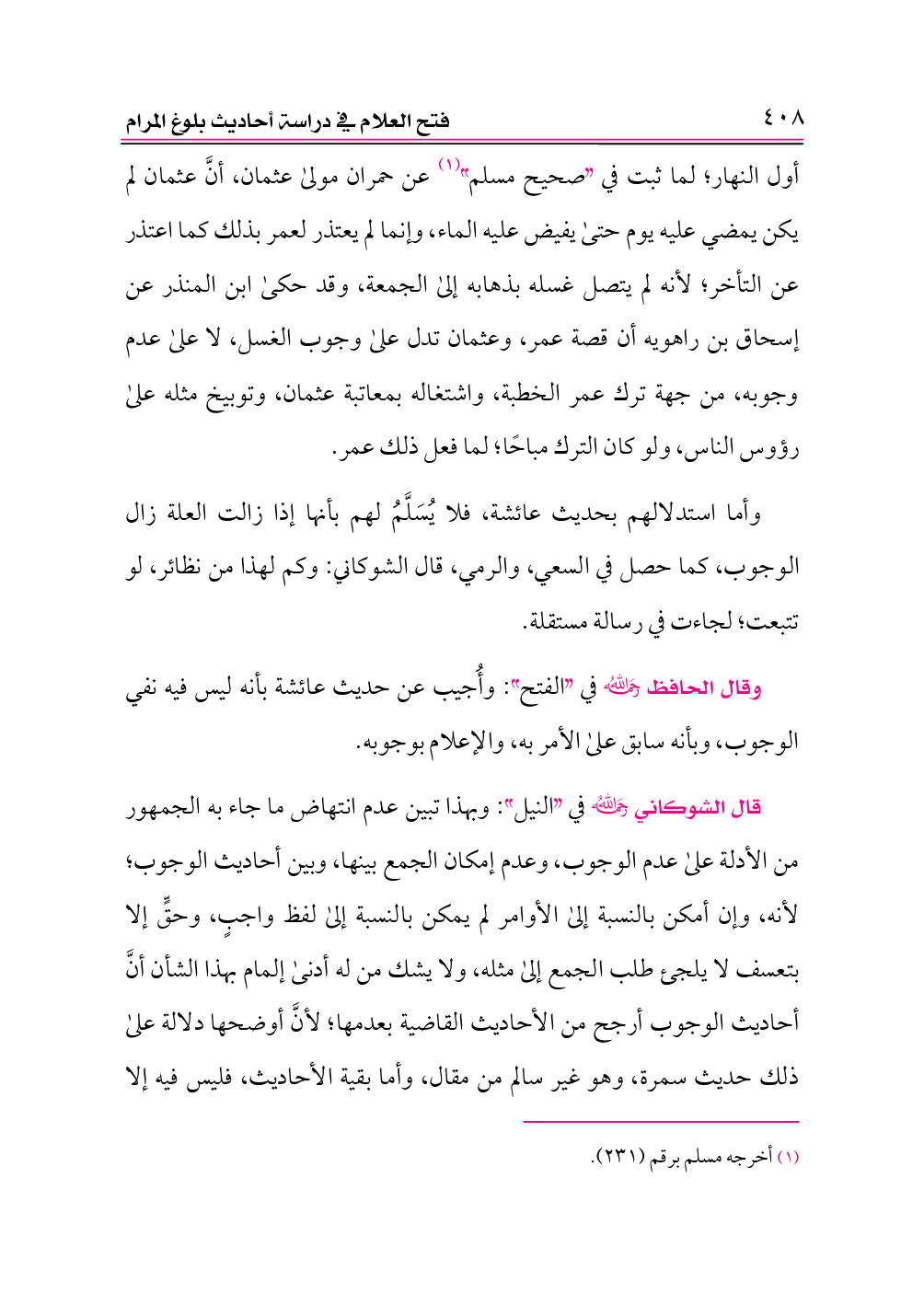 وأما استدلالهم بحديث عائشة، فلا يُسَلَّمُ لهم بأنها إذا زالت العلة زال الوجوب، كما حصل في السعي، والرمي، قال الشوكاني: وكم لهذا من نظائر، لو تتبعت؛ لجاءت في رسالة مستقلة.