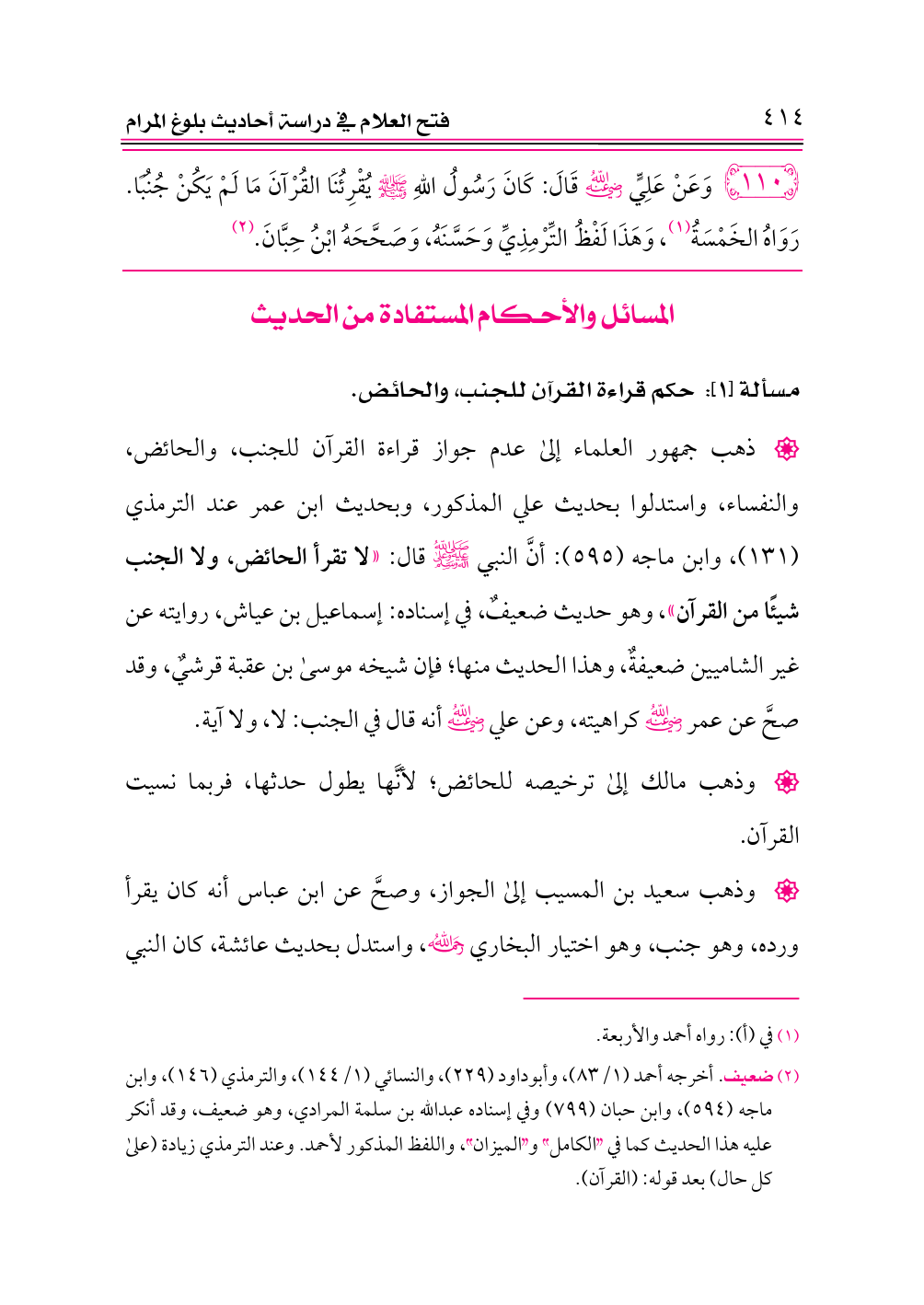 ١١٠ - وَعَنْ عَلِيٍّ -رضي الله عنه- قَالَ: كَانَ رَسُولُ اللهِ - صلى الله عليه وسلم - يُقْرِئُنَا القُرْآنَ مَا لَمْ يَكُنْ جُنُبًا. رَوَاهُ الخَمْسَةُ (¬١)، وَهَذَا لَفْظُ التِّرْمِذِيِّ وَحَسَّنَهُ، وَصَحَّحَهُ ابْنُ حِبَّانَ. (¬٢)