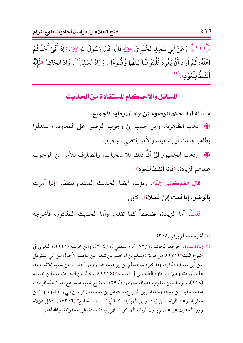 ١١١ - وَعَنْ أَبِي سَعِيدٍ الخُدْرِيِّ -رضي الله عنه- قَالَ: قَالَ رَسُولُ اللهِ - صلى الله عليه وسلم -: «إذَا أَتَى أَحَدُكُمْ أَهْلَهُ، ثُمَّ أَرَادَ أَنْ يَعُودَ فَلْيَتَوَضَّأْ بَيْنَهُمَا وُضُوءًا». رَوَاهُ مُسْلِمٌ (¬١)، زَادَ الحَاكِمُ «فَإِنَّهُ أَنْشَطُ لِلْعَوْدِ». (¬٢)