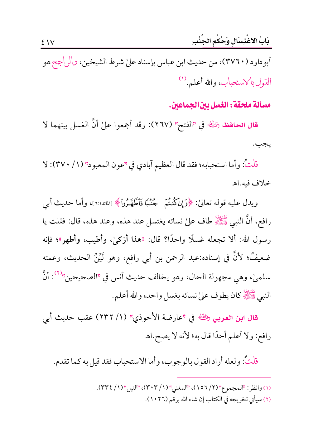 ويدل عليه قوله تعالى: {وَإِنْ كُنْتُمْ جُنُبًا فَاطَّهَّرُوا} [المائدة:٦]، وأما حديث أبي رافع، أنَّ النبي -صلى الله عليه وعلى آله وسلم- طاف على نسائه يغتسل عند هذه، وعند هذه، قال: فقلت يا رسول الله: ألا تجعله غسلًا واحدًا؟ قال: «هذا أزكى، وأطيب، وأطهر»؛ فإنه ضعيفٌ؛ لأنَّ في إسناده: عبد الرحمن بن أبي رافع، وهو لَيِّنُ الحديث، وعمته سلمى، وهي مجهولة الحال، وهو يخالف حديث أنس في «الصحيحين» (¬٢): أنَّ النبي -صلى الله عليه وعلى آله وسلم- كان يطوف على نسائه بغسل واحد، والله أعلم.