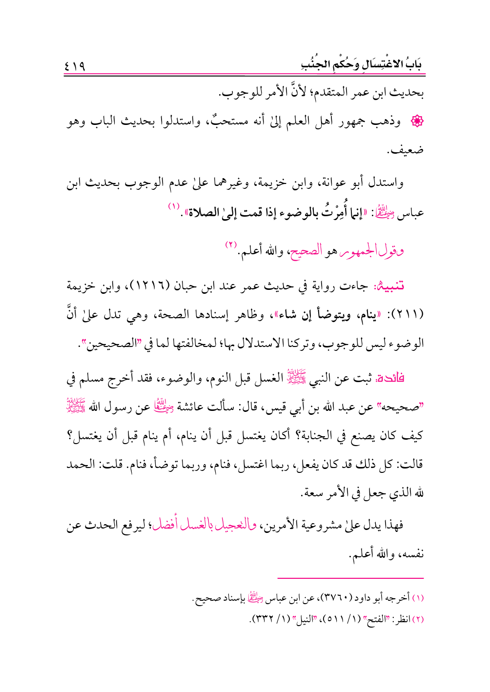 تنبيه: جاءت رواية في حديث عمر عند ابن حبان (١٢١٦)، وابن خزيمة (٢١١): «ينام، ويتوضأ إن شاء»، وظاهر إسنادها الصحة، وهي تدل على أنَّ الوضوء ليس للوجوب، وتركنا الاستدلال بها؛ لمخالفتها لما في «الصحيحين».