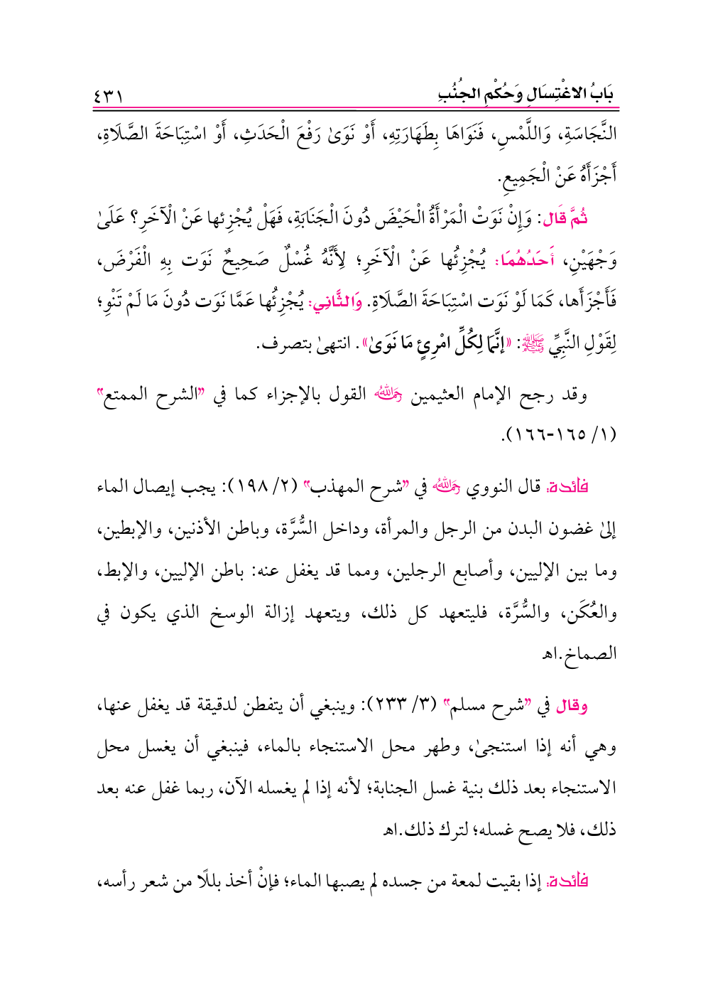 وقال في «شرح مسلم» (٣/ ٢٣٣): وينبغي أن يتفطن لدقيقة قد يغفل عنها، وهي أنه إذا استنجى، وطهر محل الاستنجاء بالماء، فينبغي أن يغسل محل الاستنجاء بعد ذلك بنية غسل الجنابة؛ لأنه إذا لم يغسله الآن، ربما غفل عنه بعد ذلك، فلا يصح غسله؛ لترك ذلك. اهـ