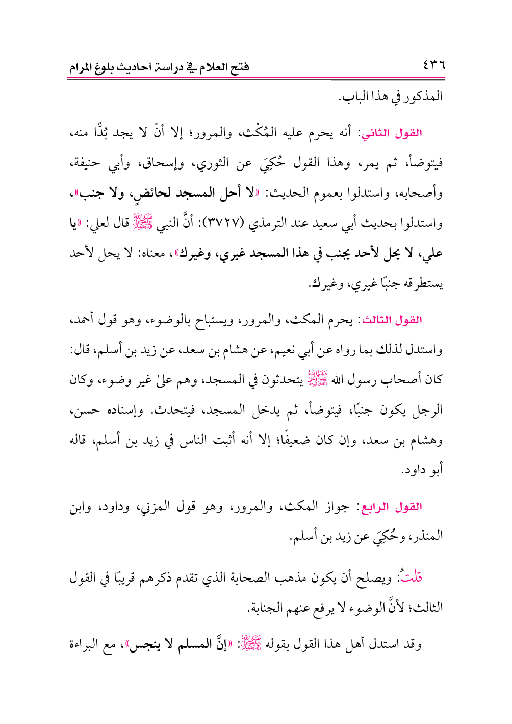 القول الثالث: يحرم المكث، والمرور، ويستباح بالوضوء، وهو قول أحمد، واستدل لذلك بما رواه عن أبي نعيم، عن هشام بن سعد، عن زيد بن أسلم، قال: كان أصحاب رسول الله -صلى الله عليه وعلى آله وسلم- يتحدثون في المسجد، وهم على غير وضوء، وكان الرجل يكون جنبًا، فيتوضأ، ثم يدخل المسجد، فيتحدث. وإسناده حسن، وهشام بن سعد، وإن كان ضعيفًا؛ إلا أنه أثبت الناس في زيد بن أسلم، قاله أبو داود.