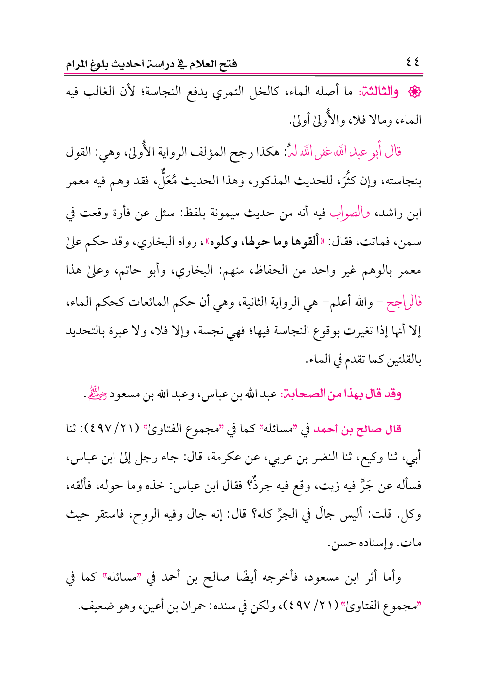 قال أبو عبد الله غفر الله لهُ: هكذا رجح المؤلف الرواية الأُولى، وهي: القول بنجاسته، وإن كثُرَ، للحديث المذكور، وهذا الحديث مُعَلٌّ، فقد وهم فيه معمر ابن راشد، والصواب فيه أنه من حديث ميمونة بلفظ: سئل عن فأرة وقعت في سمن، فماتت، فقال: «ألقوها وما حولها، وكلوه»، رواه البخاري، وقد حكم على معمر بالوهم غير واحد من الحفاظ، منهم: البخاري، وأبو حاتم، وعلى هذا فالراجح - والله أعلم- هي الرواية الثانية، وهي أن حكم المائعات كحكم الماء، إلا أنها إذا تغيرت بوقوع النجاسة فيها؛ فهي نجسة، وإلا فلا، ولا عبرة بالتحديد بالقلتين كما تقدم في الماء.