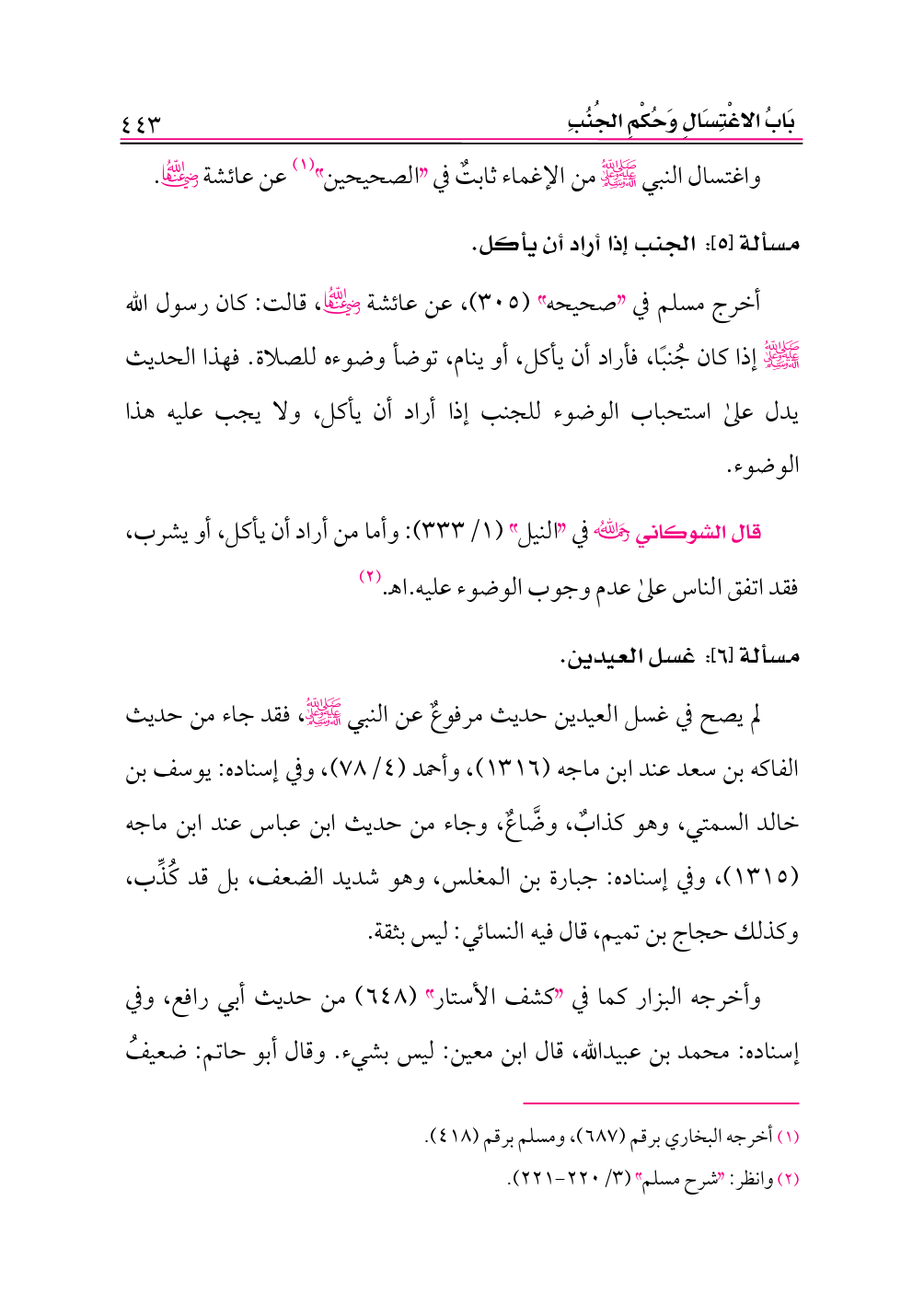 لم يصح في غسل العيدين حديث مرفوعٌ عن النبي -صلى الله عليه وعلى آله وسلم-، فقد جاء من حديث الفاكه بن سعد عند ابن ماجه (١٣١٦)، وأحمد (٤/ ٧٨)، وفي إسناده: يوسف بن خالد السمتي، وهو كذابٌ، وضَّاعٌ، وجاء من حديث ابن عباس عند ابن ماجه (١٣١٥)، وفي إسناده: جبارة بن المغلس، وهو شديد الضعف، بل قد كُذِّب، وكذلك حجاج بن تميم، قال فيه النسائي: ليس بثقة.