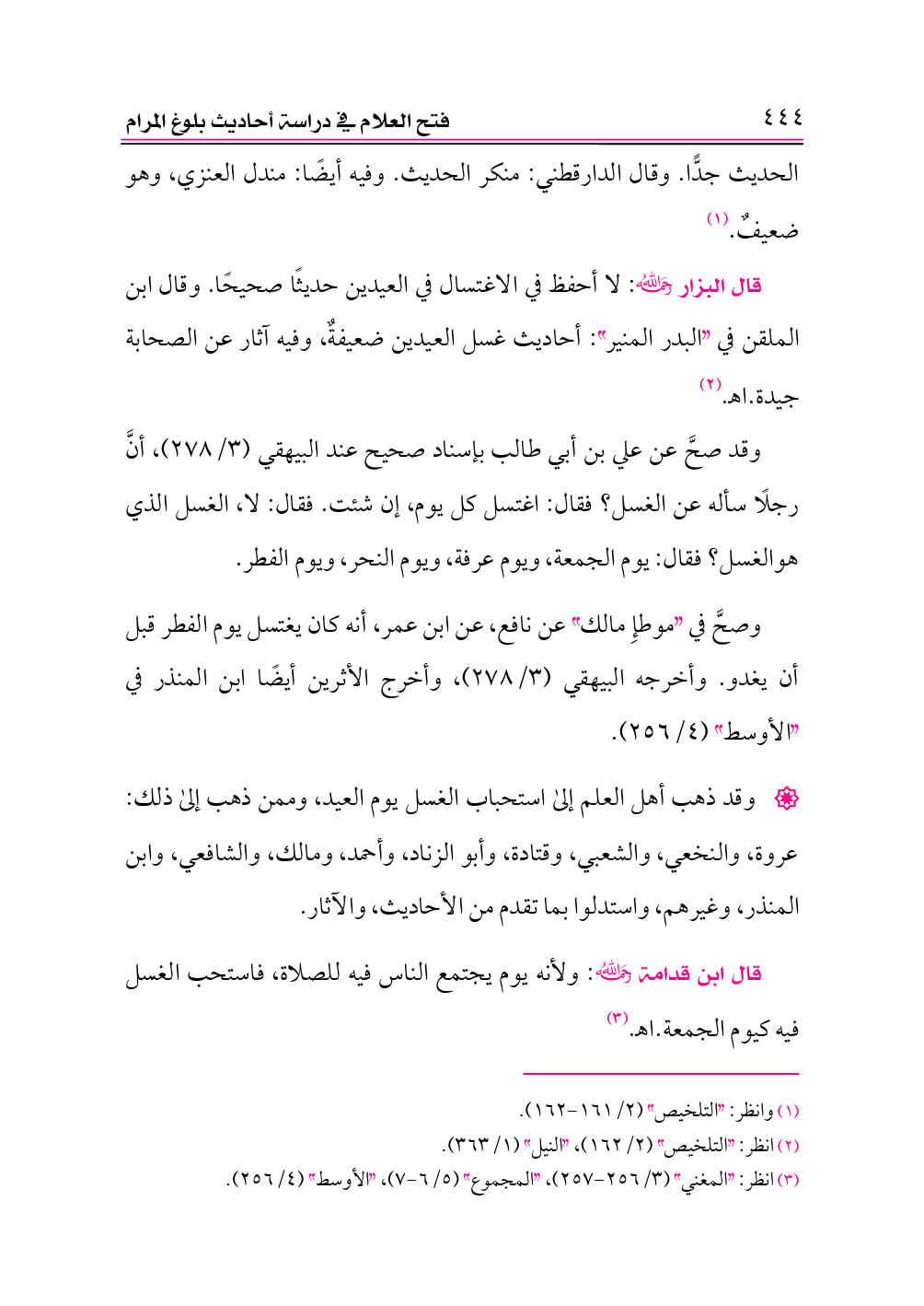 قال البزار -رحمه الله-: لا أحفظ في الاغتسال في العيدين حديثًا صحيحًا. وقال ابن الملقن في «البدر المنير»: أحاديث غسل العيدين ضعيفةٌ، وفيه آثار عن الصحابة جيدة. اهـ. (¬٢)