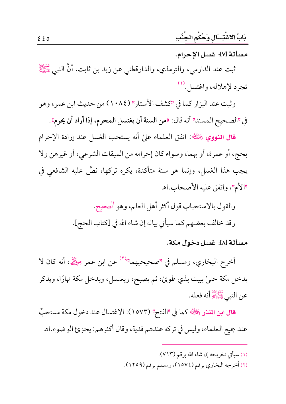 وثبت عند البزار كما في «كشف الأستار» (١٠٨٤) من حديث ابن عمر، وهو في «الصحيح المسند» أنه قال: «من السنة أن يغتسل المحرم، إذا أراد أن يحرم».