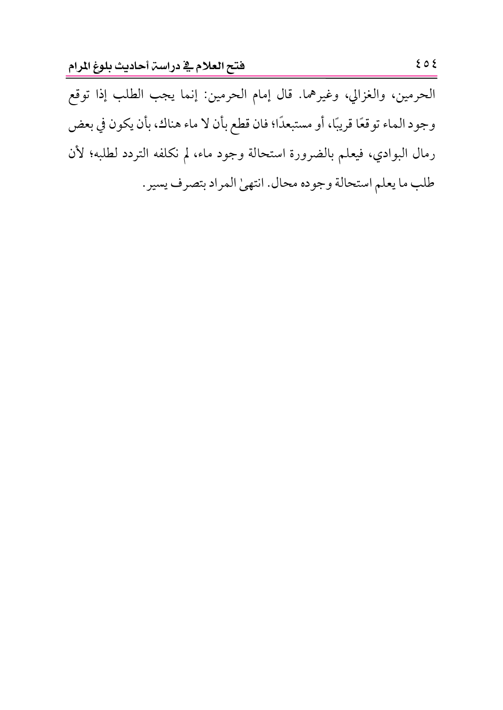 الحرمين، والغزالي، وغيرهما. قال إمام الحرمين: إنما يجب الطلب إذا توقع وجود الماء توقعًا قريبًا، أو مستبعدًا؛ فان قطع بأن لا ماء هناك، بأن يكون في بعض رمال البوادي، فيعلم بالضرورة استحالة وجود ماء، لم نكلفه التردد لطلبه؛ لأن طلب ما يعلم استحالة وجوده محال. انتهى المراد بتصرف يسير.