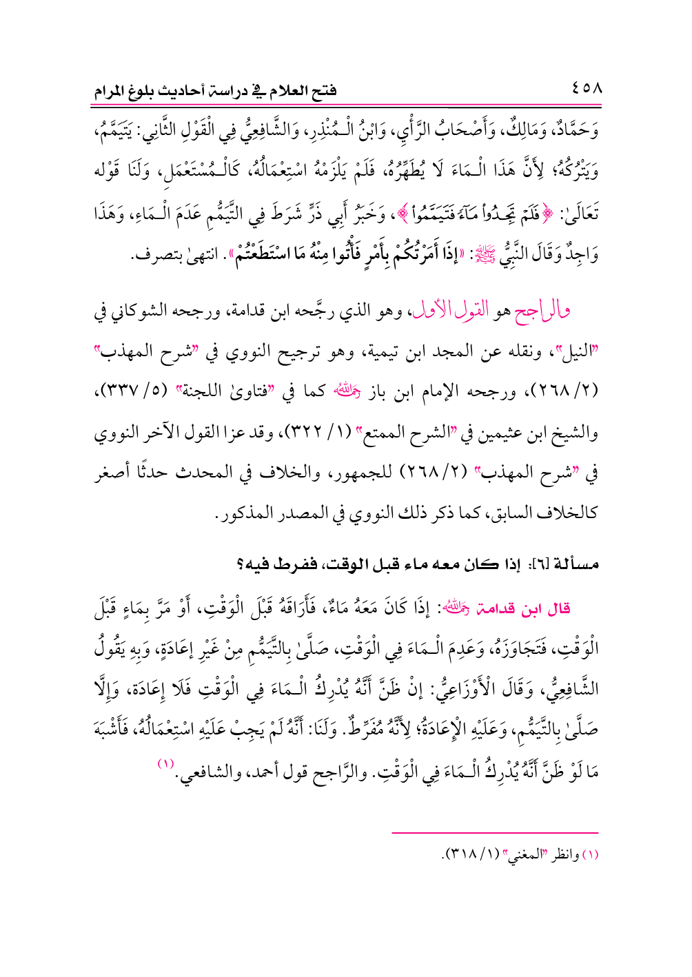 وَحَمَّادٌ، وَمَالِكٌ، وَأَصْحَابُ الرَّأْيِ، وَابْنُ الْمُنْذِرِ، وَالشَّافِعِيُّ فِي الْقَوْلِ الثَّانِي: يَتَيَمَّمُ، وَيَتْرُكُهُ؛ لِأَنَّ هَذَا الْمَاءَ لَا يُطَهِّرُهُ، فَلَمْ يَلْزَمْهُ اسْتِعْمَالُهُ، كَالْمُسْتَعْمَلِ، وَلَنَا قَوْله تَعَالَى: {فَلَمْ تَجِدُوا مَاءً فَتَيَمَّمُوا}، وَخَبَرُ أَبِي ذَرٍّ شَرَطَ فِي التَّيَمُّمِ عَدَمَ الْمَاءِ، وَهَذَا وَاجِدٌ وَقَالَ النَّبِيُّ - صلى الله عليه وسلم -: «إذَا أَمَرْتُكُمْ بِأَمْرٍ فَأْتُوا مِنْهُ مَا اسْتَطَعْتُمْ». انتهى بتصرف.